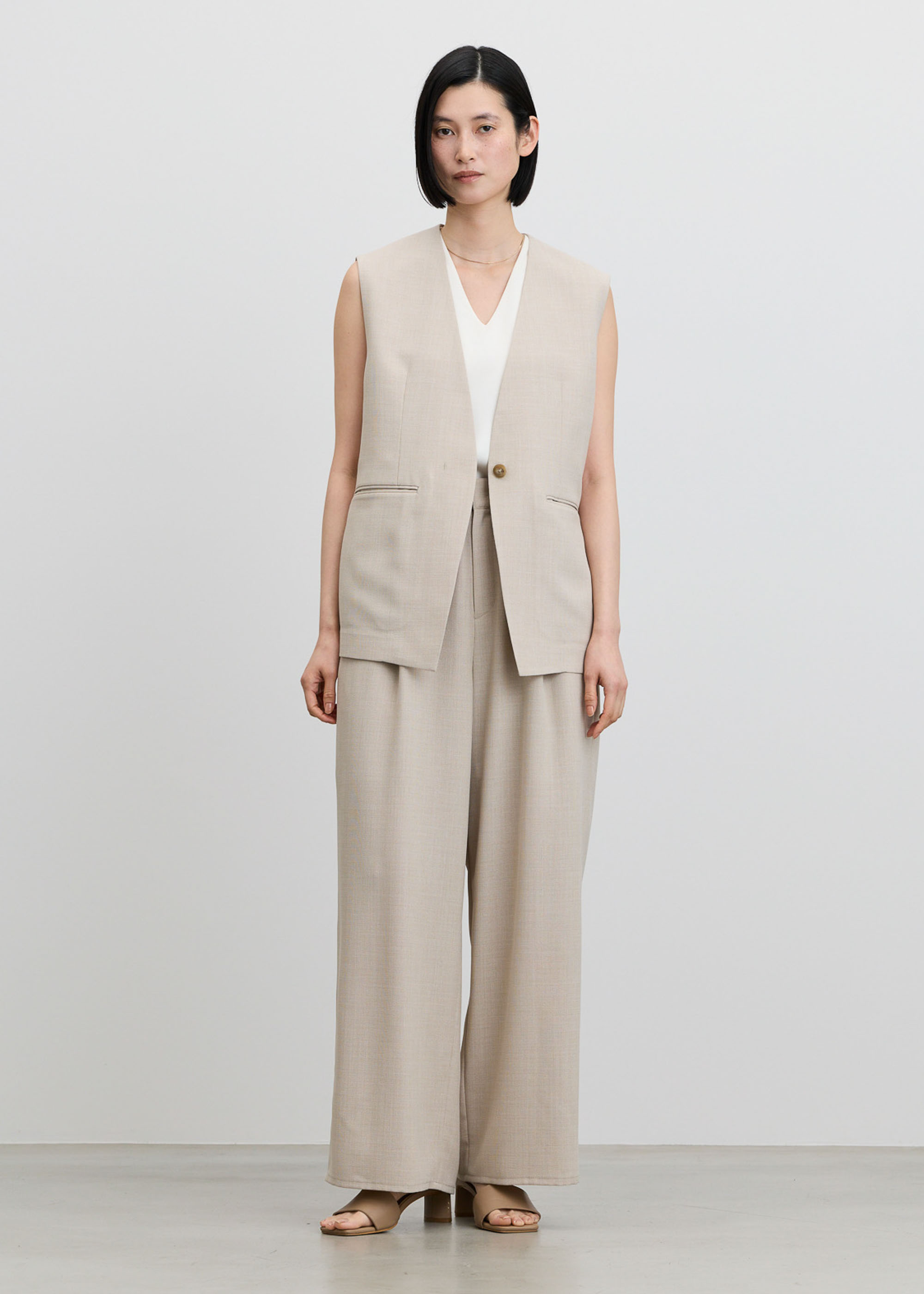 凛とした印象を与えるVネックと、少し立ち上げた後ろ襟によって、沈まずに端正な襟元に。アウターを重ねても整ったVネックを保ち、装いにスマートなアクセントを加えます。襟元とアームホールはステッチが表に出ない仕様で、ディテールまでもきれいに仕立てています。前後で丈感に差を付けた裾はやわらかな曲線を描き、インしてもアウトしてもバランスのよい設計にしています。