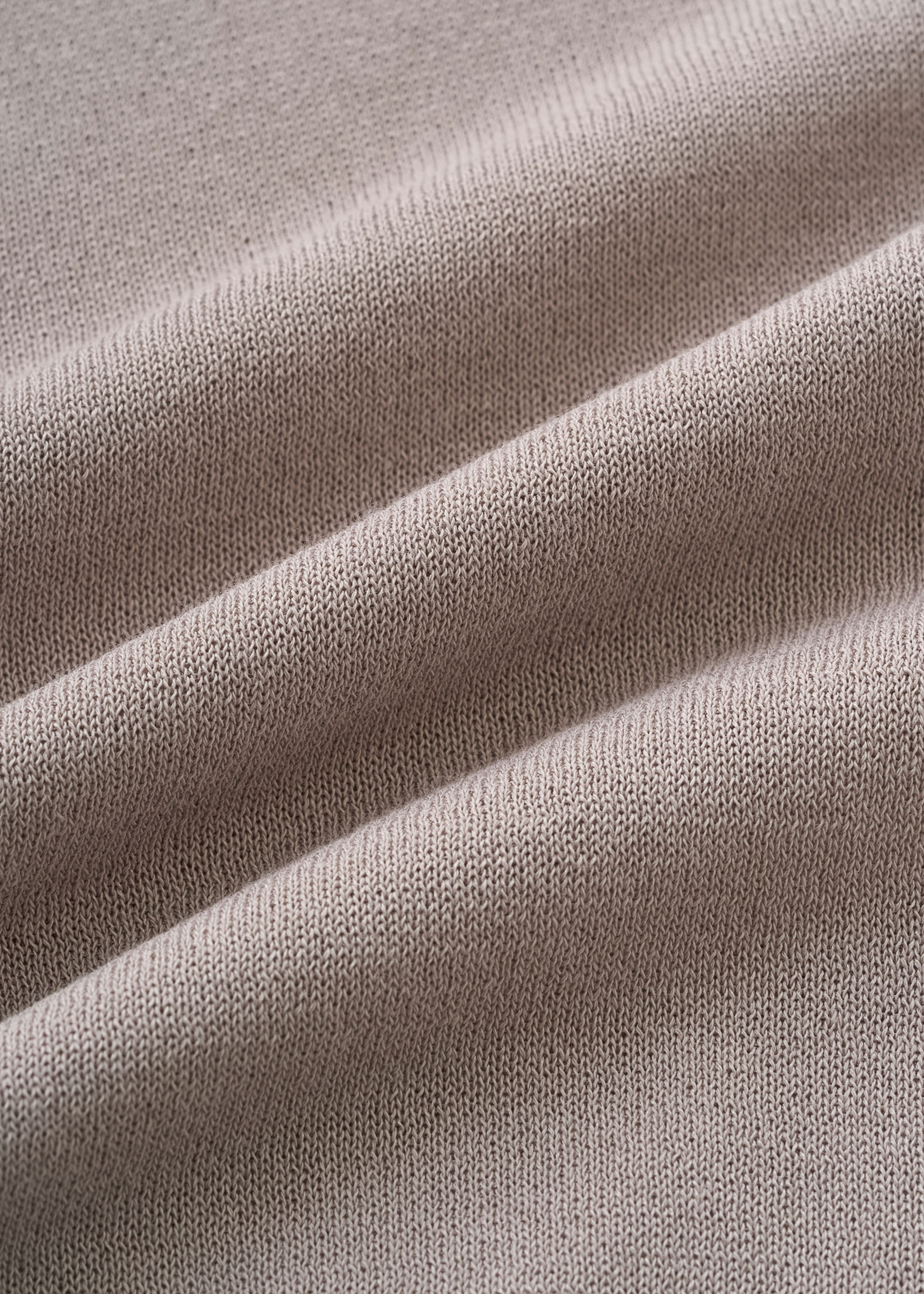 レーヨン77%とナイロン23%の混率で編み立てたニットは、しっとりとした滑らかな手触りが特徴。接触冷感性も備え、涼しい着心地を維持します。