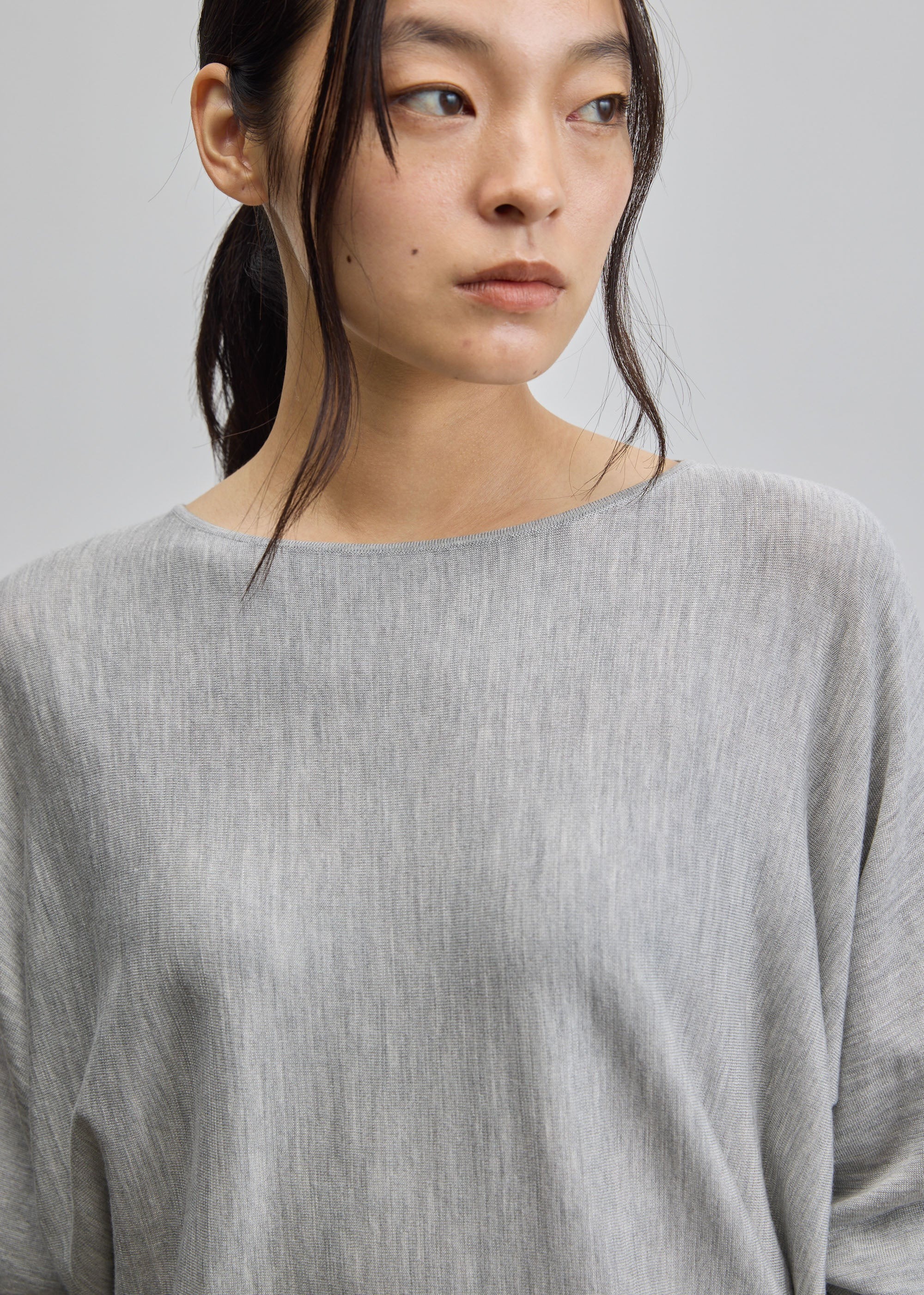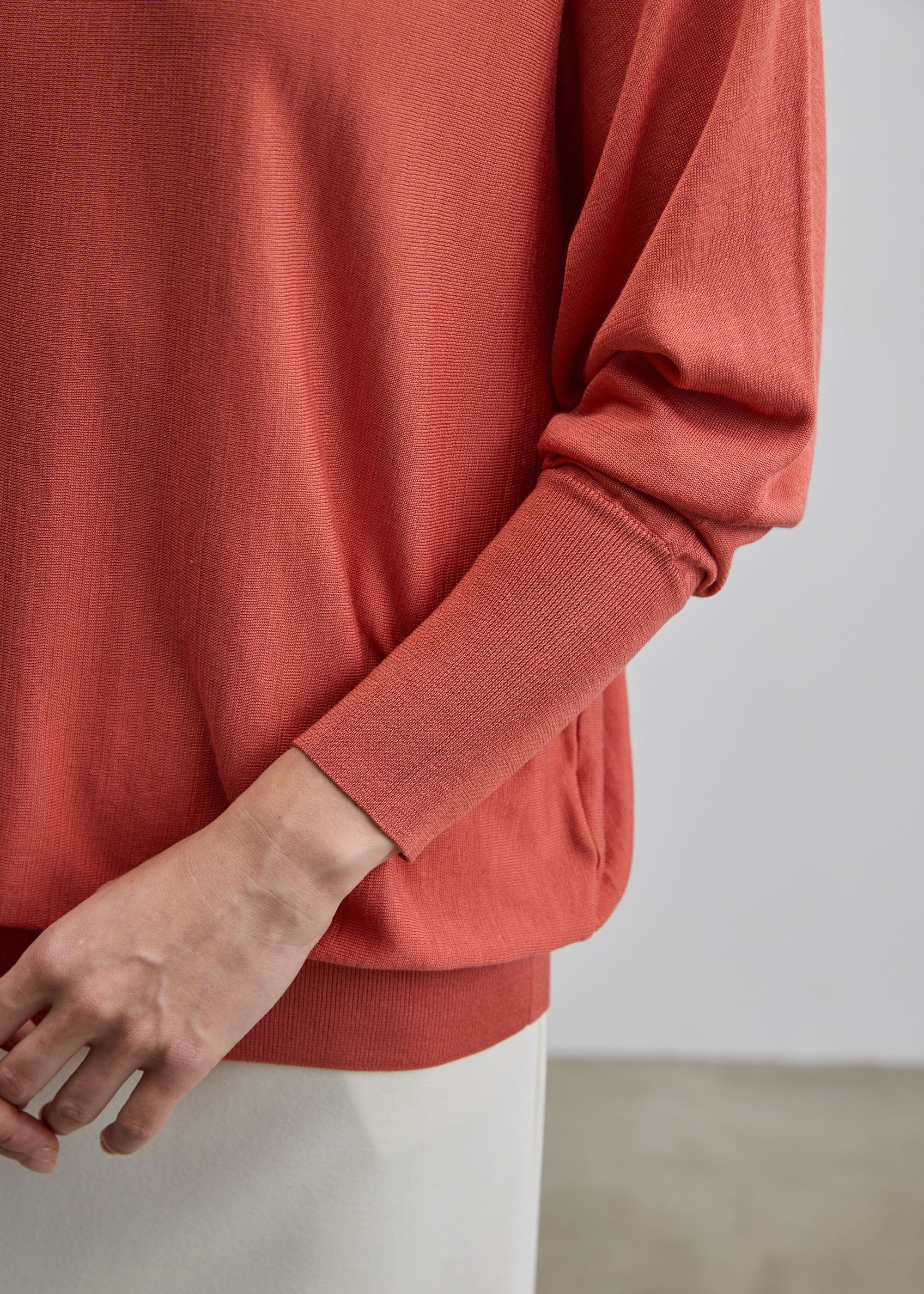 ほんのり艶感のある素材が生み出す美しいドレープ感も体感いただけるよう、程よくゆったりとしたサイズ感に。一枚でさらりと着用いただくと、大人の優美な印象を演出します。とはいえ程よいサイジングなので、ジャケットを重ねてもすっきりと着こなしていただけるように仕上げました。