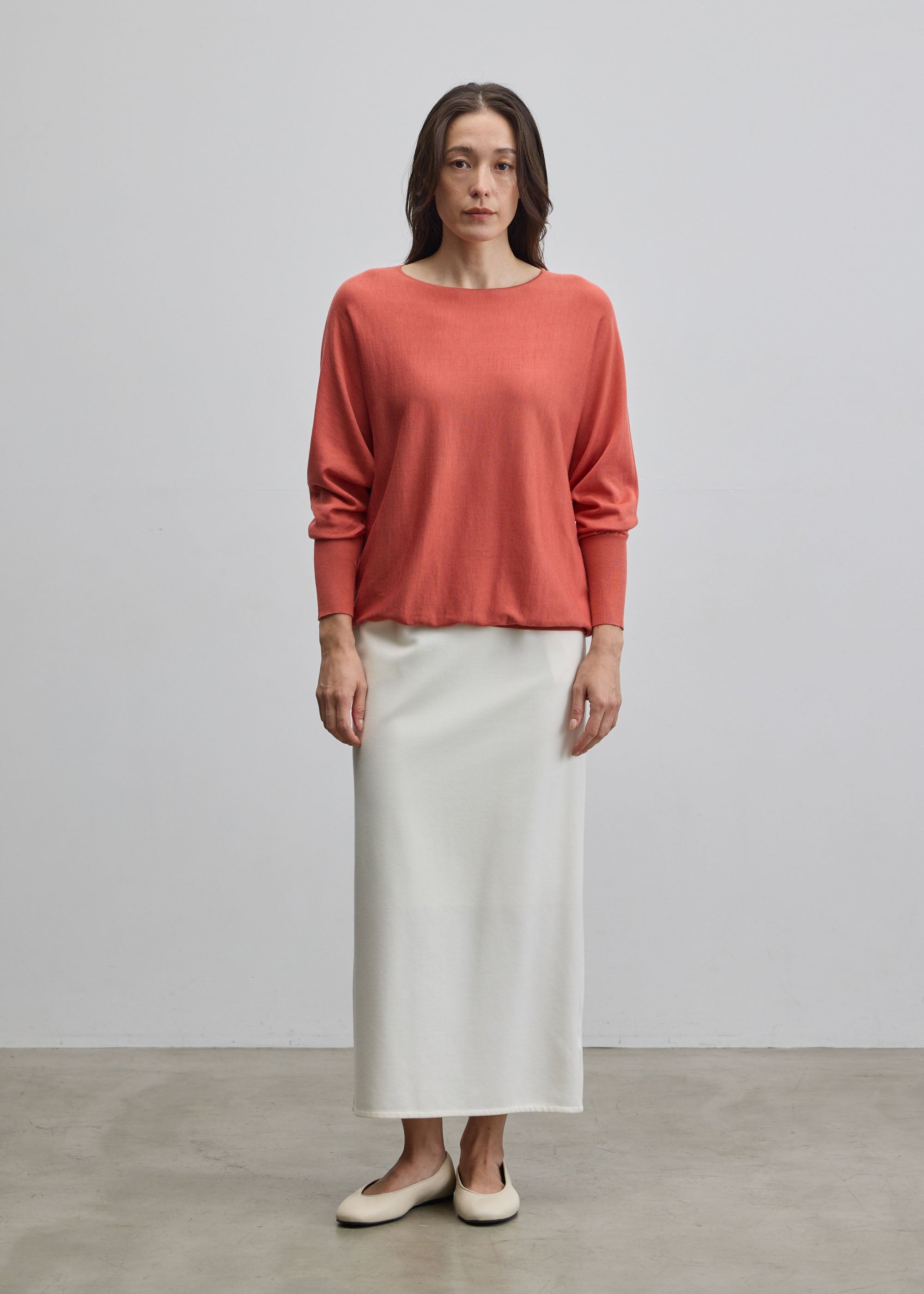 合わせるボトムスを選ばないニットは、スマートなパンツはもちろんプリーツスカートなどボリュームのあるボトムスを合わせた着こなしもおすすめ。揺らめくスカートの裾とシルクの艶感が歩くたび印象的に映り、美しい佇まいを演出します。