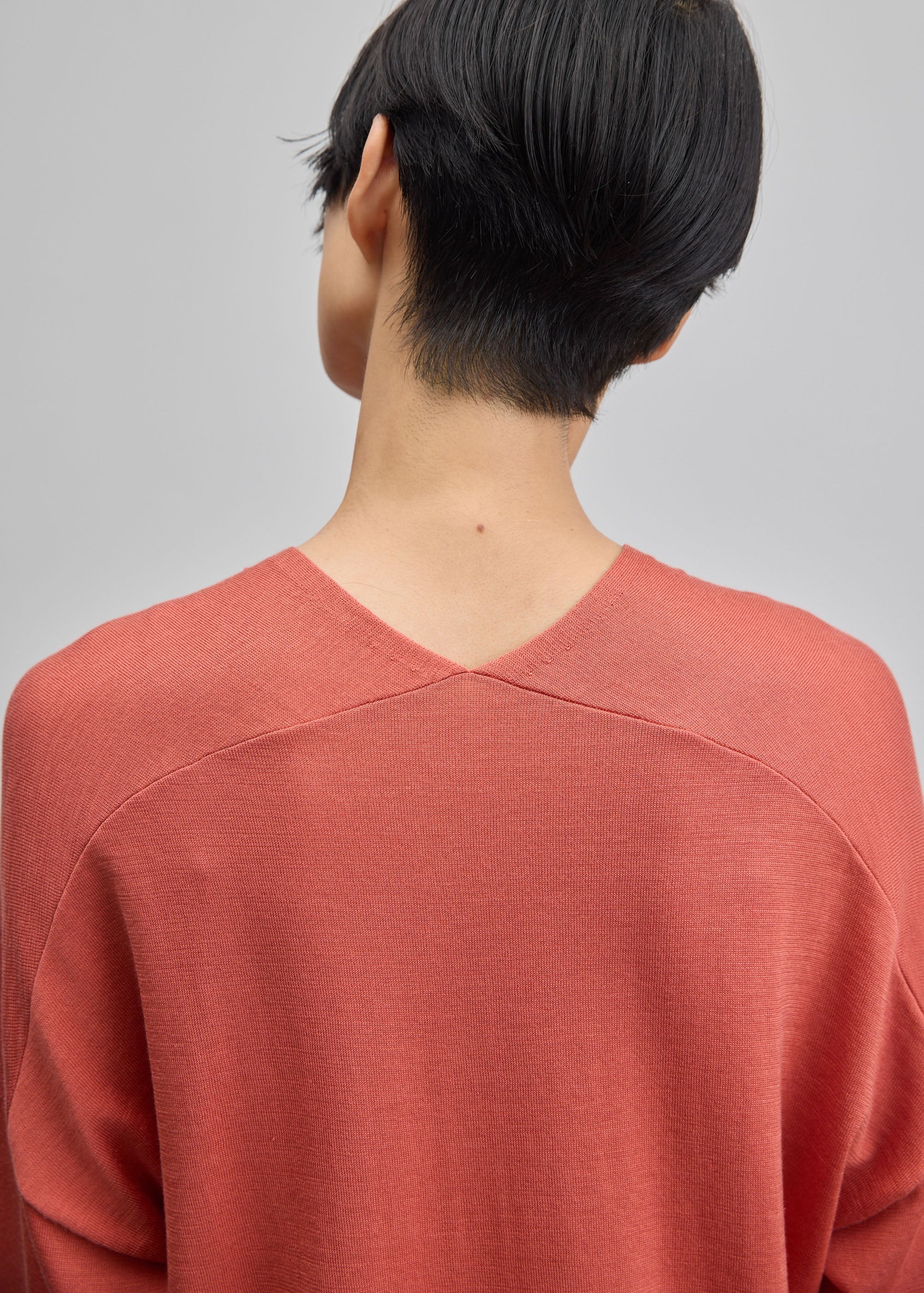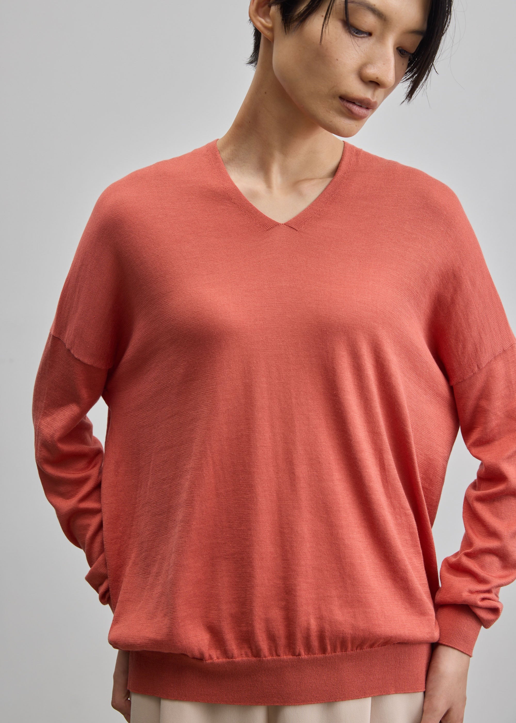 Vネックの深さは浅めにとり、襟元の両サイドはほんの少し首に沿うような細めの形状に仕上げることで上品に。