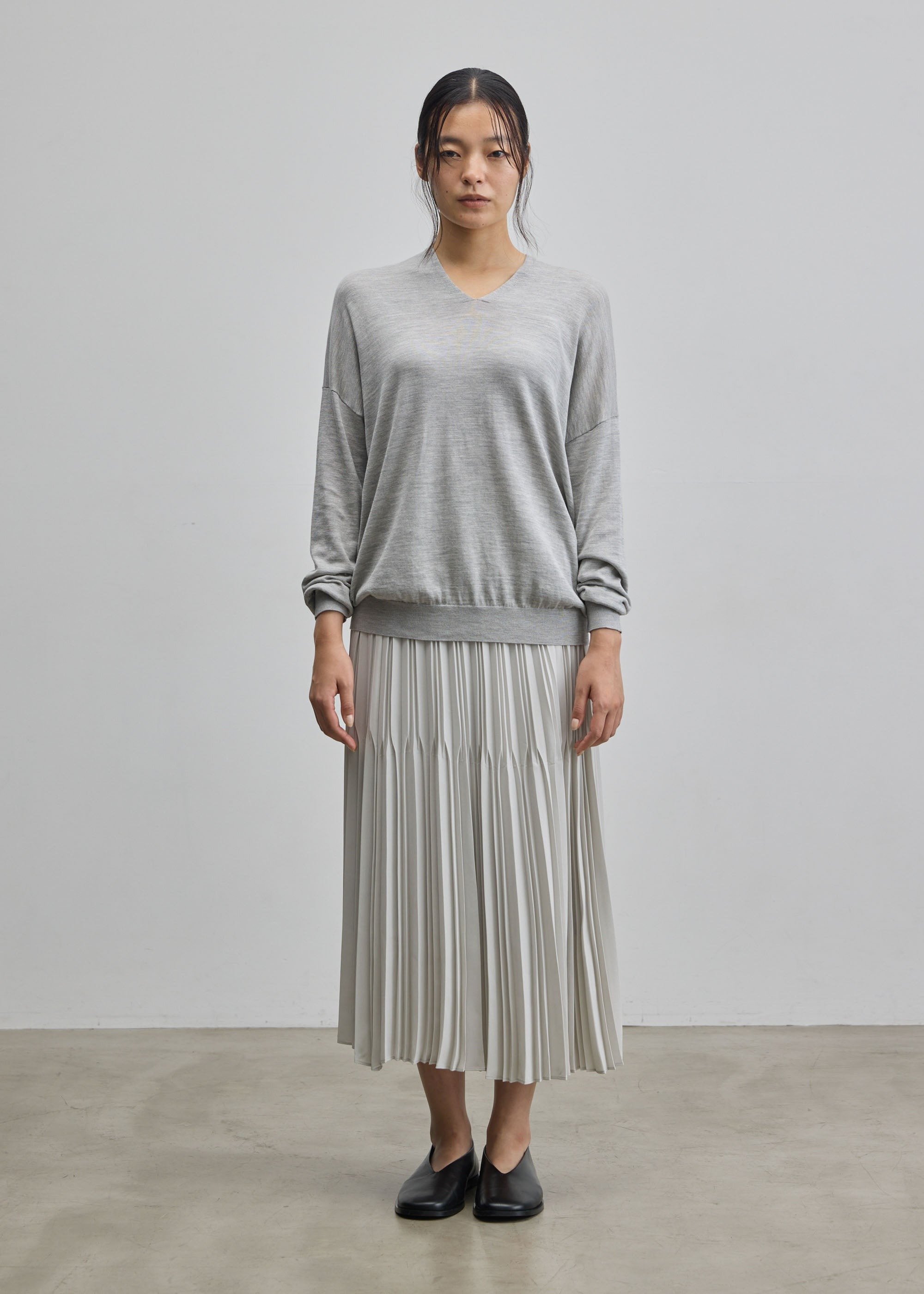 TOPS:シルクコットンVネックニット(L.GRAY)SKIRT:プリーツスカート(L.GRAY / 85cm)