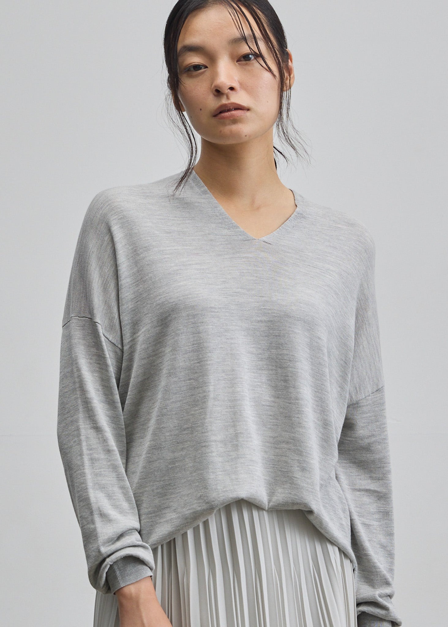 Vネックの深さは浅めにとり、襟元の両サイドはほんの少し首に沿うような細めの形状に仕上げることで上品に。