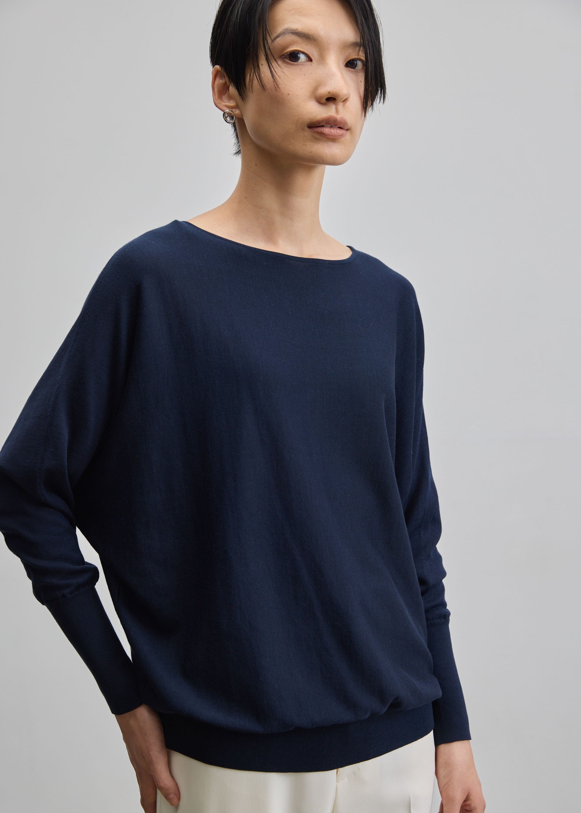 上品な素材とリラクシーなシルエットの掛け合わせで、大人の品格を醸すシルクコットンボートネックニット。シルクの微光沢と体が程よく泳ぐシルエットで高揚感をもたらす一枚です。