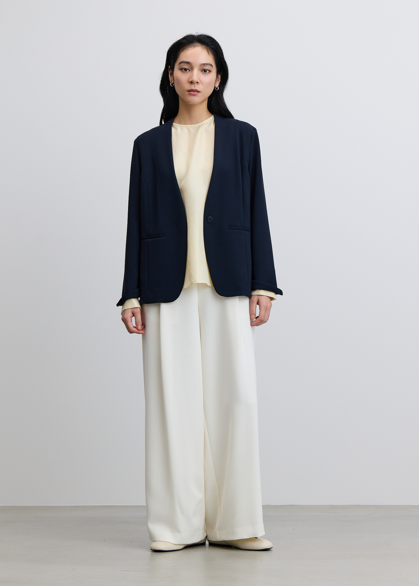 OUTER:ノーカラージャケット(NAVY)PANTS:タックワイドパンツ(WHITE)