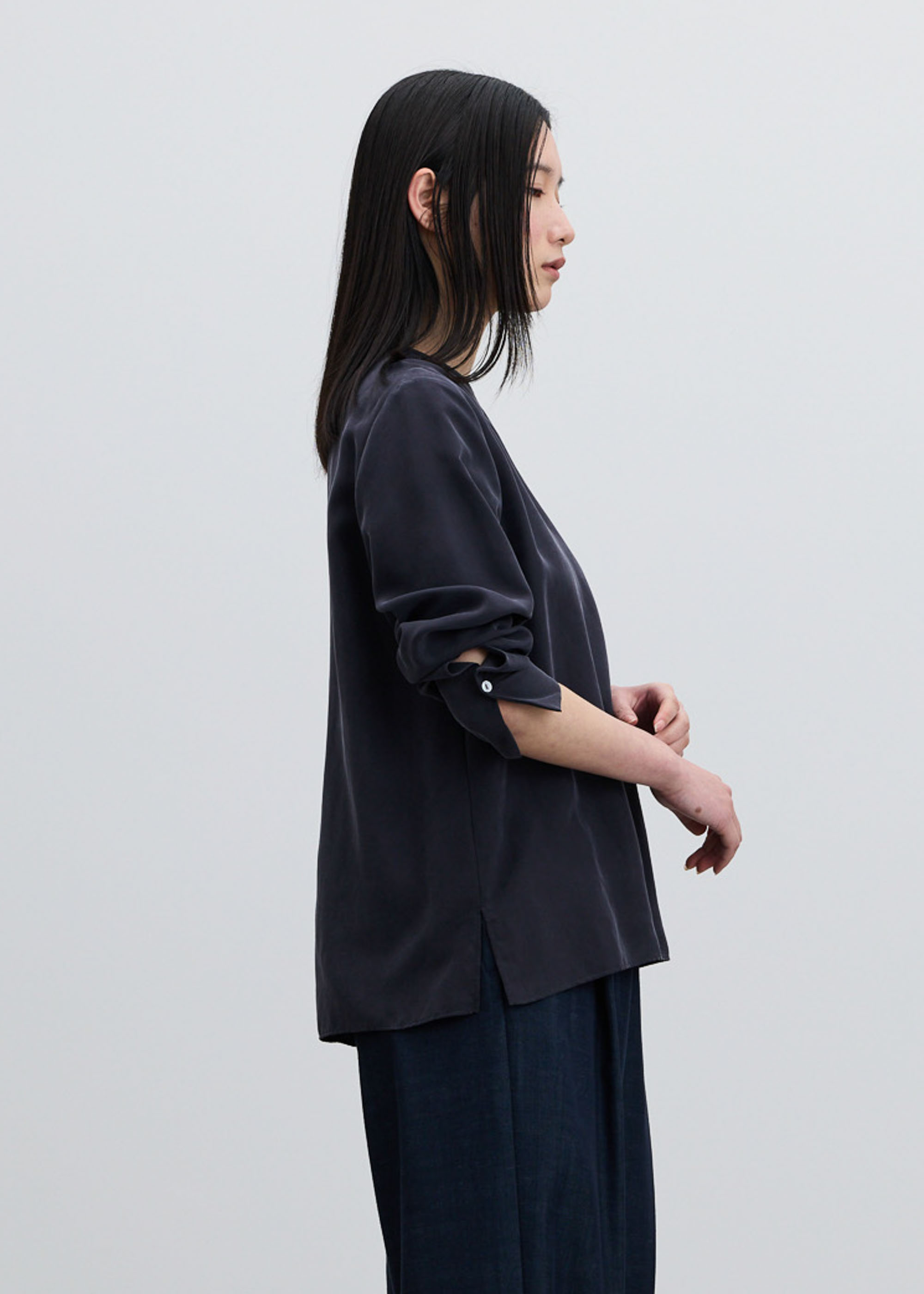 一枚でも凛とした美しさのあるブラウス。長めに設計されたエレガントなカフスは、折り返すことで、腕の長さや着方に自在にアジャストすることができます。