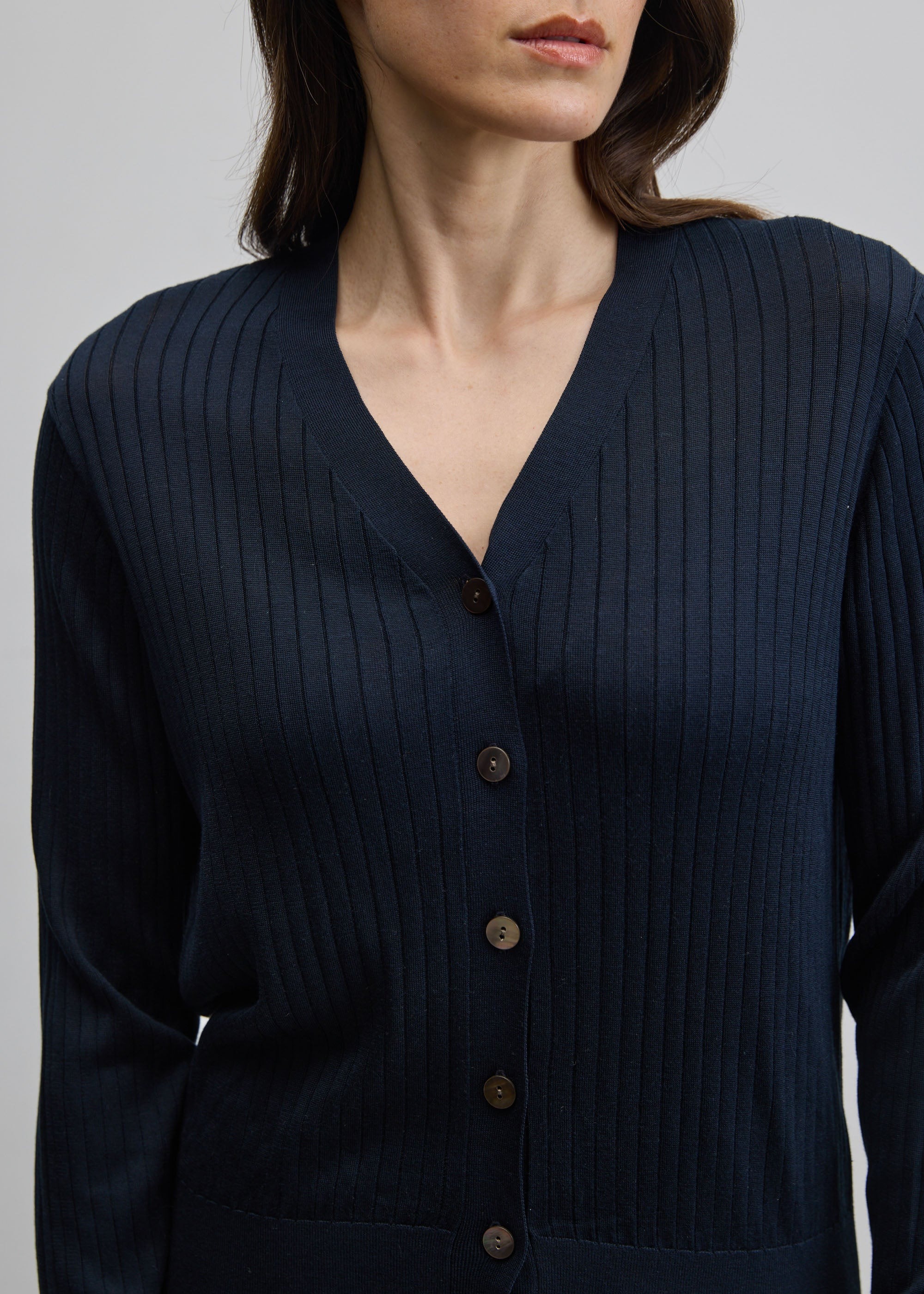 そんな思いをこめてソージュが目指したものは、シンプルだけど高級感があるニット。上品な光沢と華やかな発色、肌になめらかに触れる質感……大人のベーシックの最高峰とも言える、オールシルクのワイドリブニットシリーズ。今回はVネックカーディガンのご紹介です。