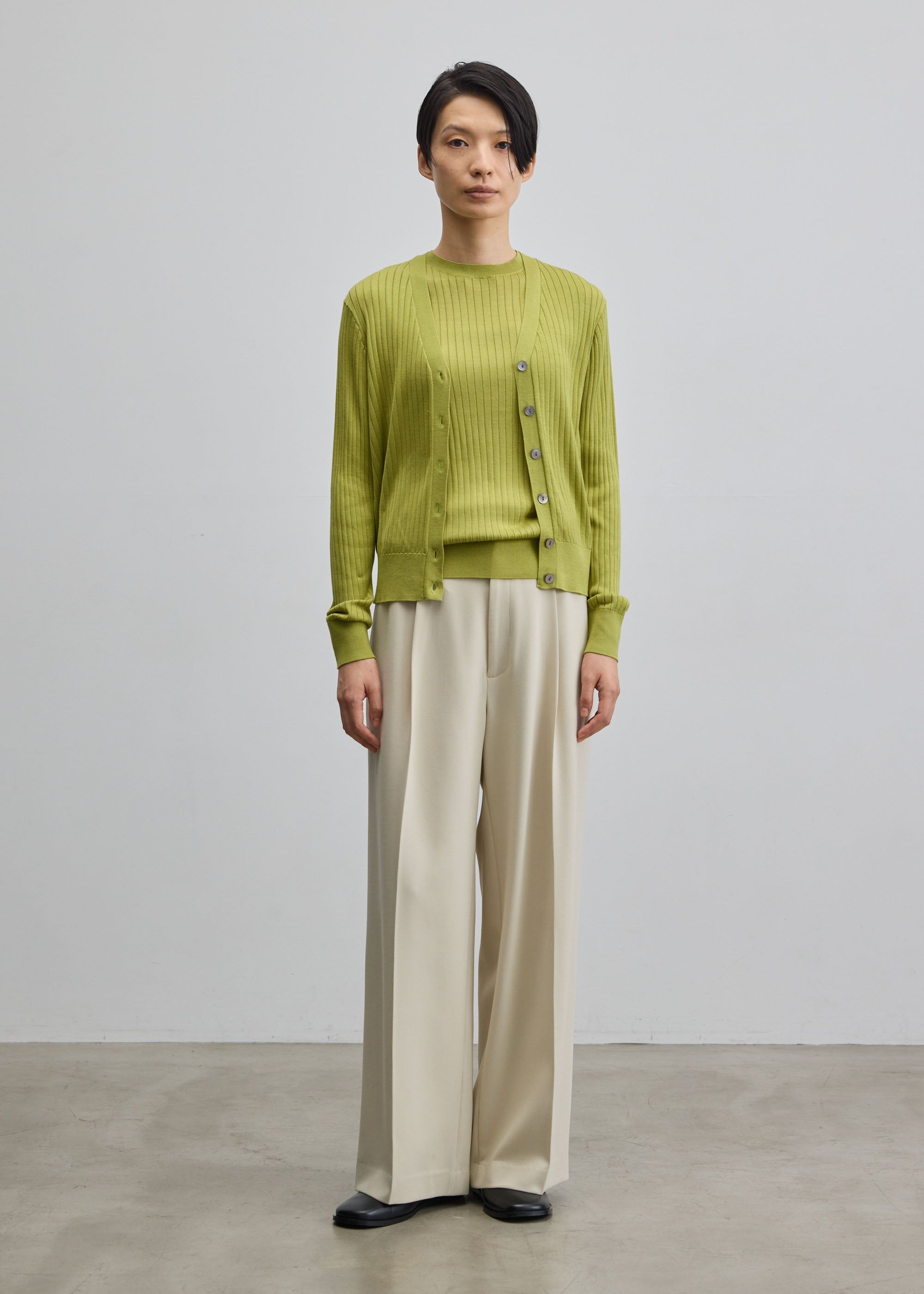 シルクワイドリブノースリブニットとのアンサンブル着用もおすすめですが、こちらのカーディガンは、キャミソールに重ねてトップス感覚で着ていただくのもすてきです。