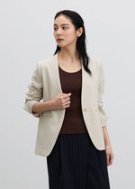 コクーンブラウスのなめらかなドレープに自然になじむスラントタック、余白の美しさを感じさせるスタイリング。モカブラウンがヘルシーな温かさを添えて、やさしい雰囲気に。