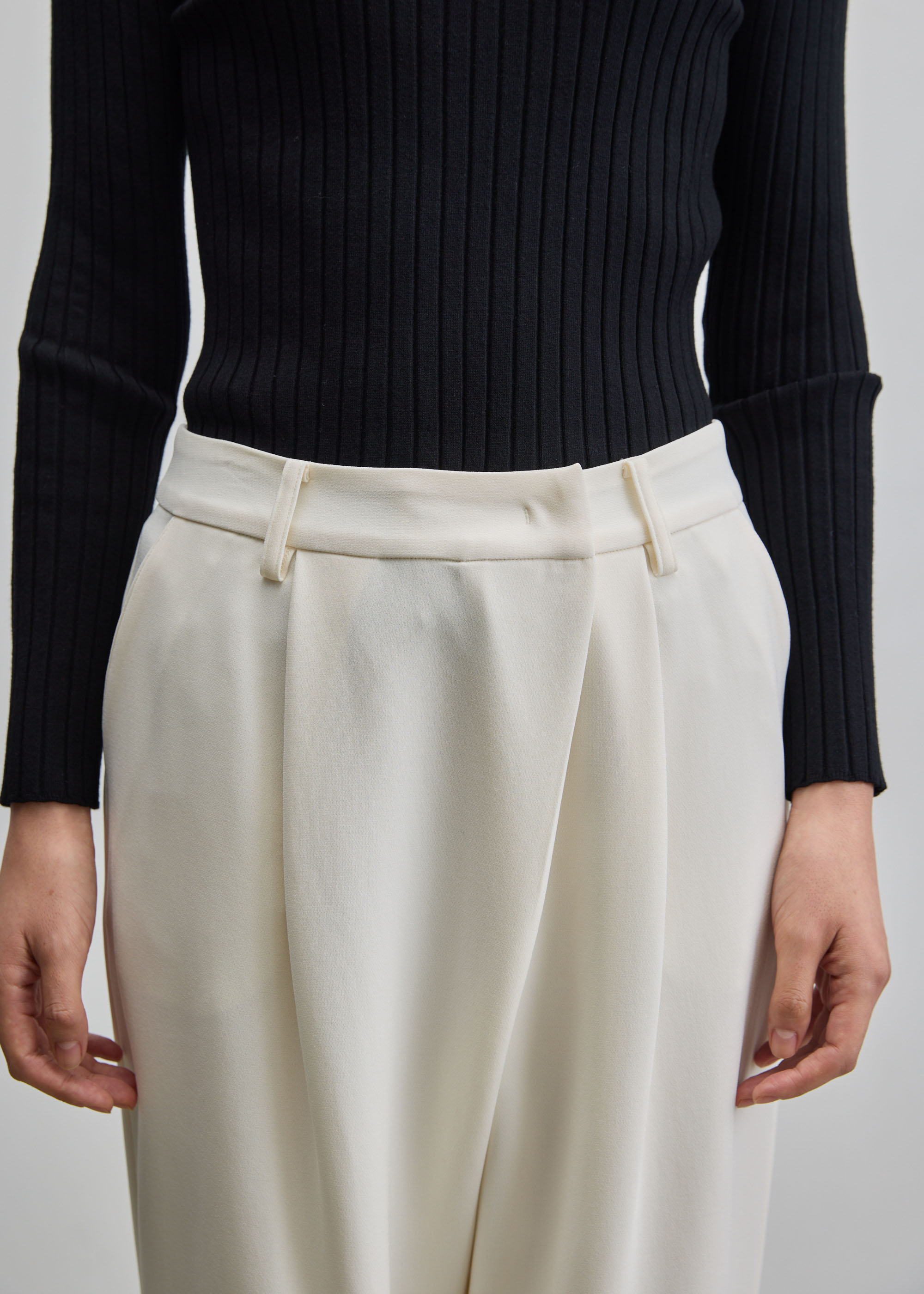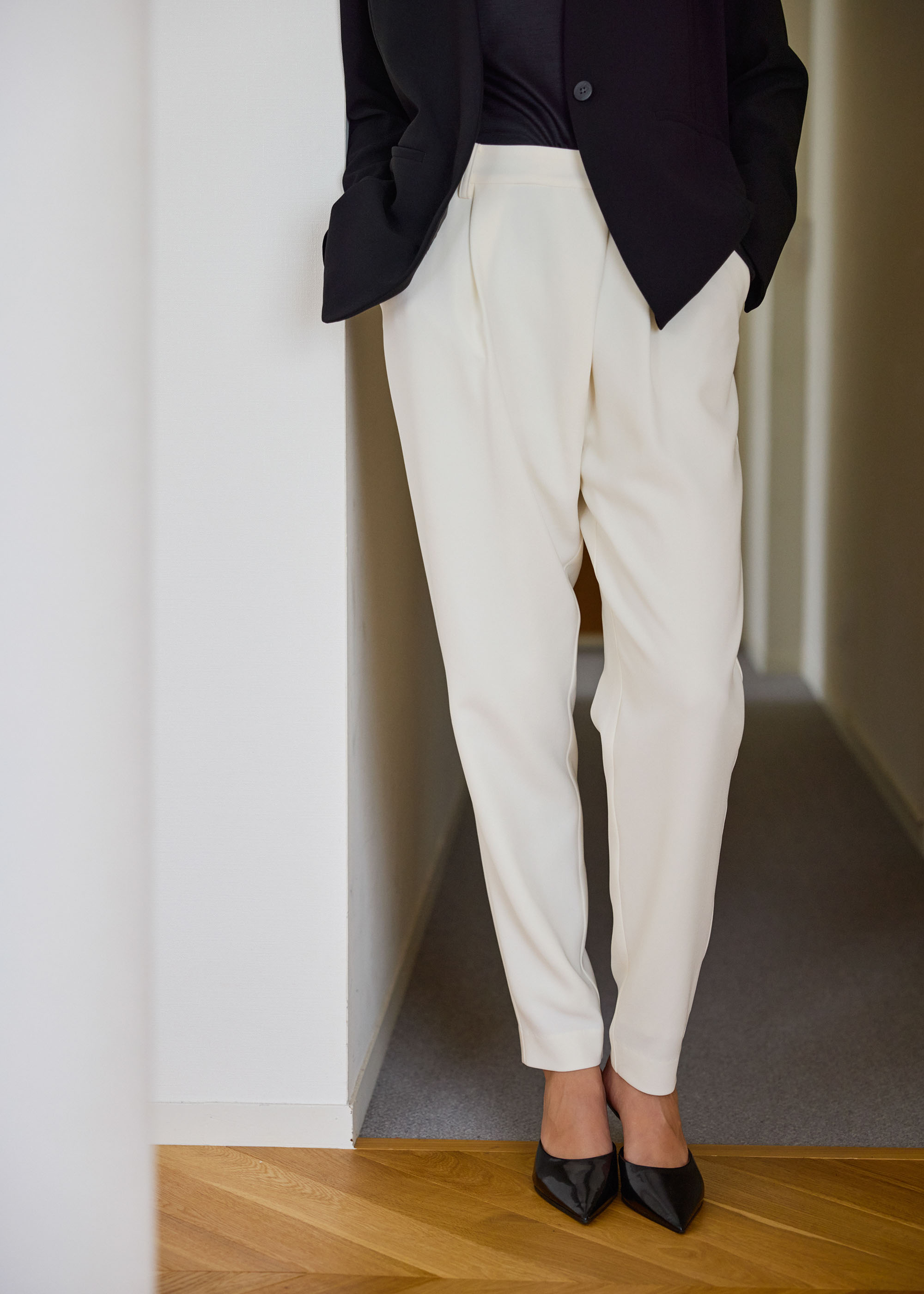 ラップデザインの「巻く」タックパンツ。斜めのラインで自信を持てるスタイルに