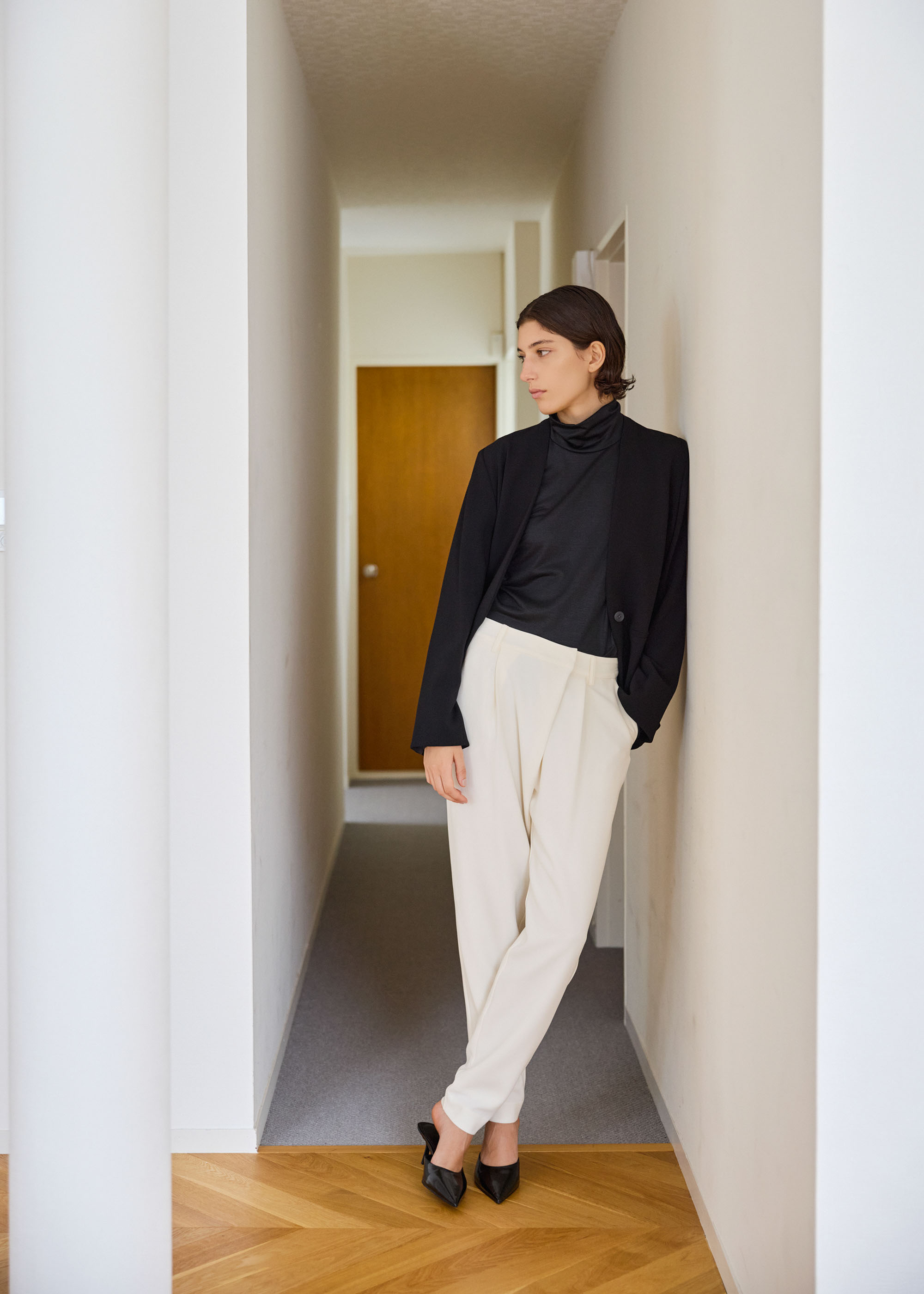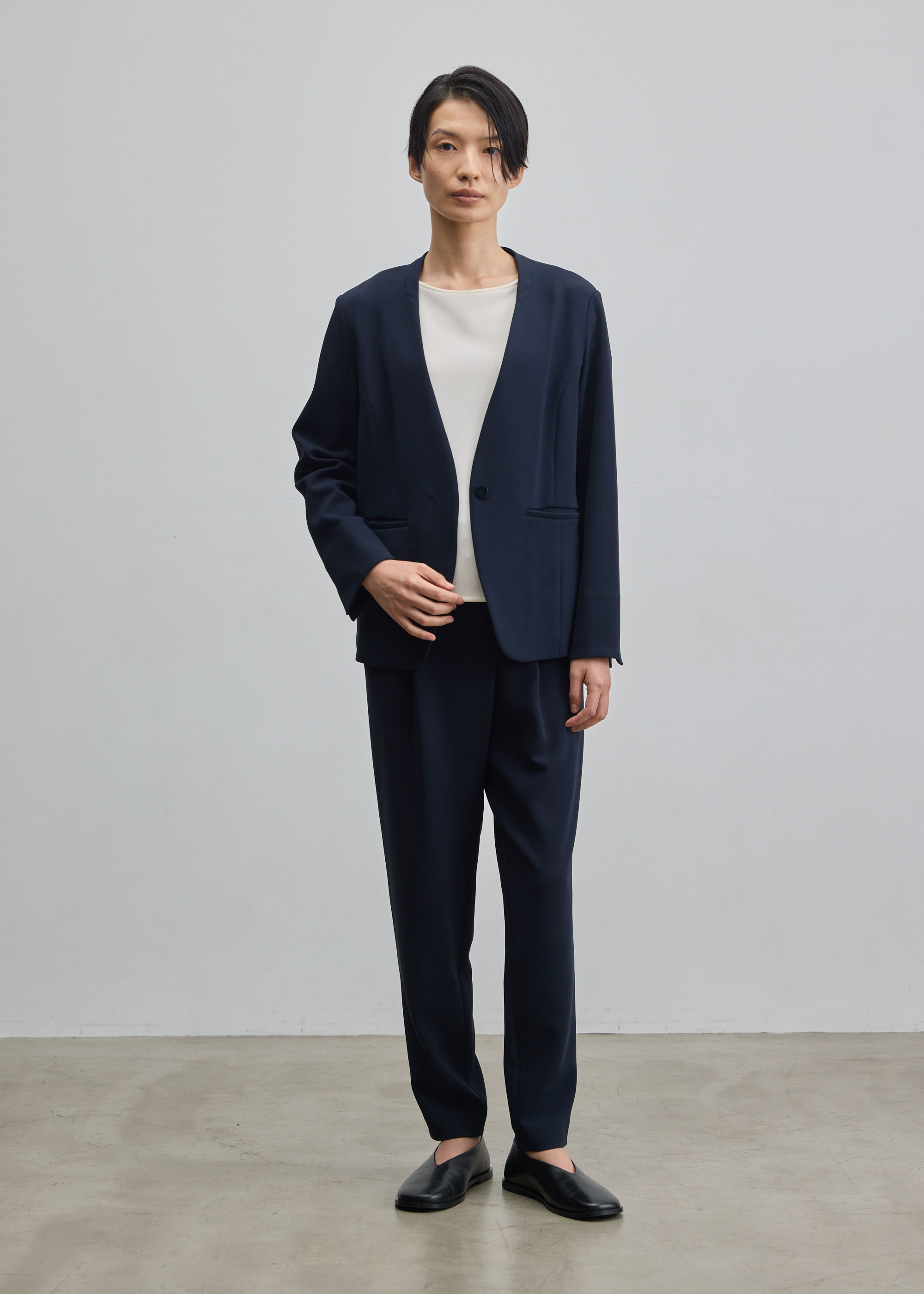 同素材のエスダブルクロスのノーカラージャケットと組み合わせた、スタイリッシュなセットアップスタイル。きちんと感はありつつも、生地の自然なドレープが美しく、どこか抜け感ある着こなしに。