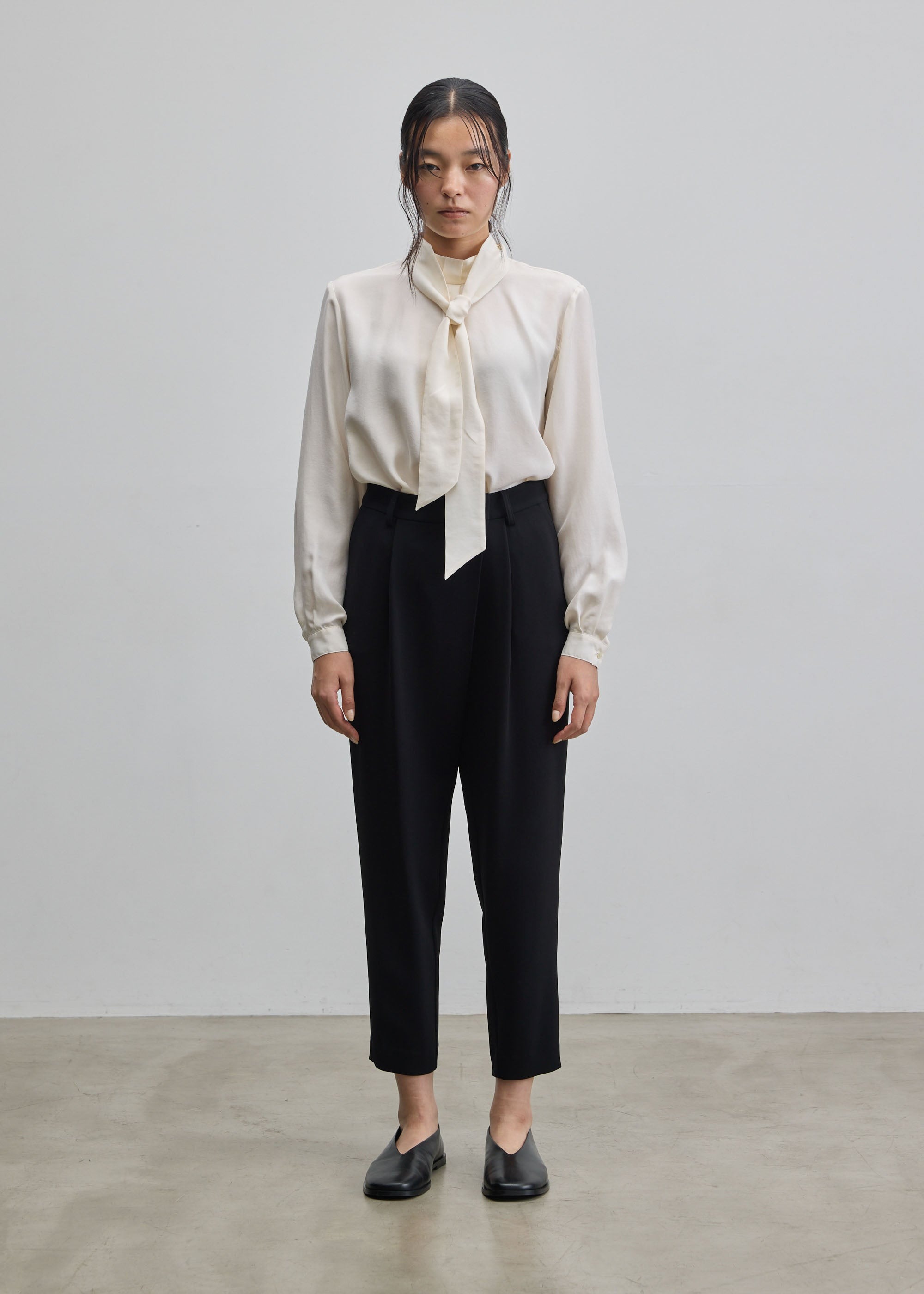 クラシカルな雰囲気のボウタイブラウスと合わせて、モノトーンコーデの凛とした印象のスタイリング。トップスをインすることで縦長のラインが生きて、腰高な印象に。