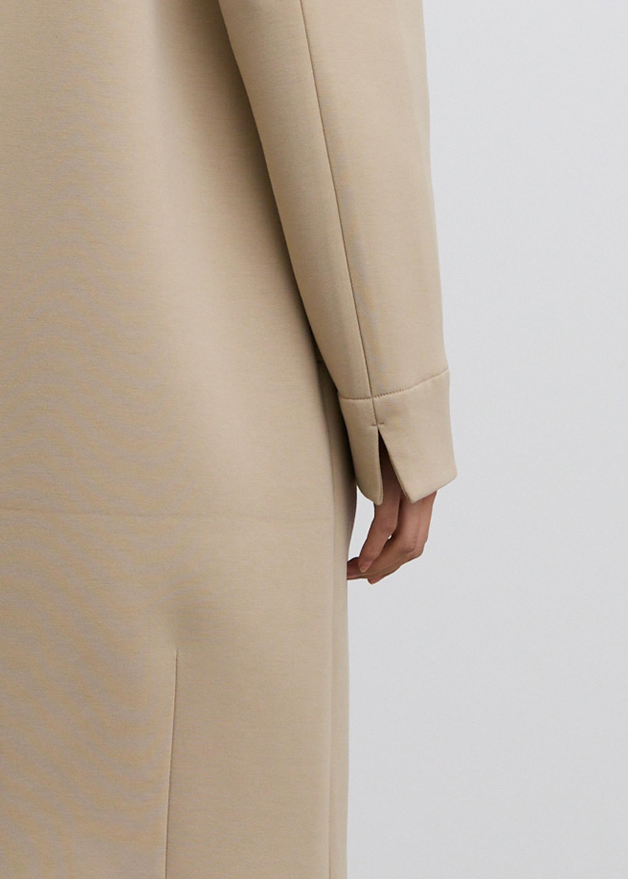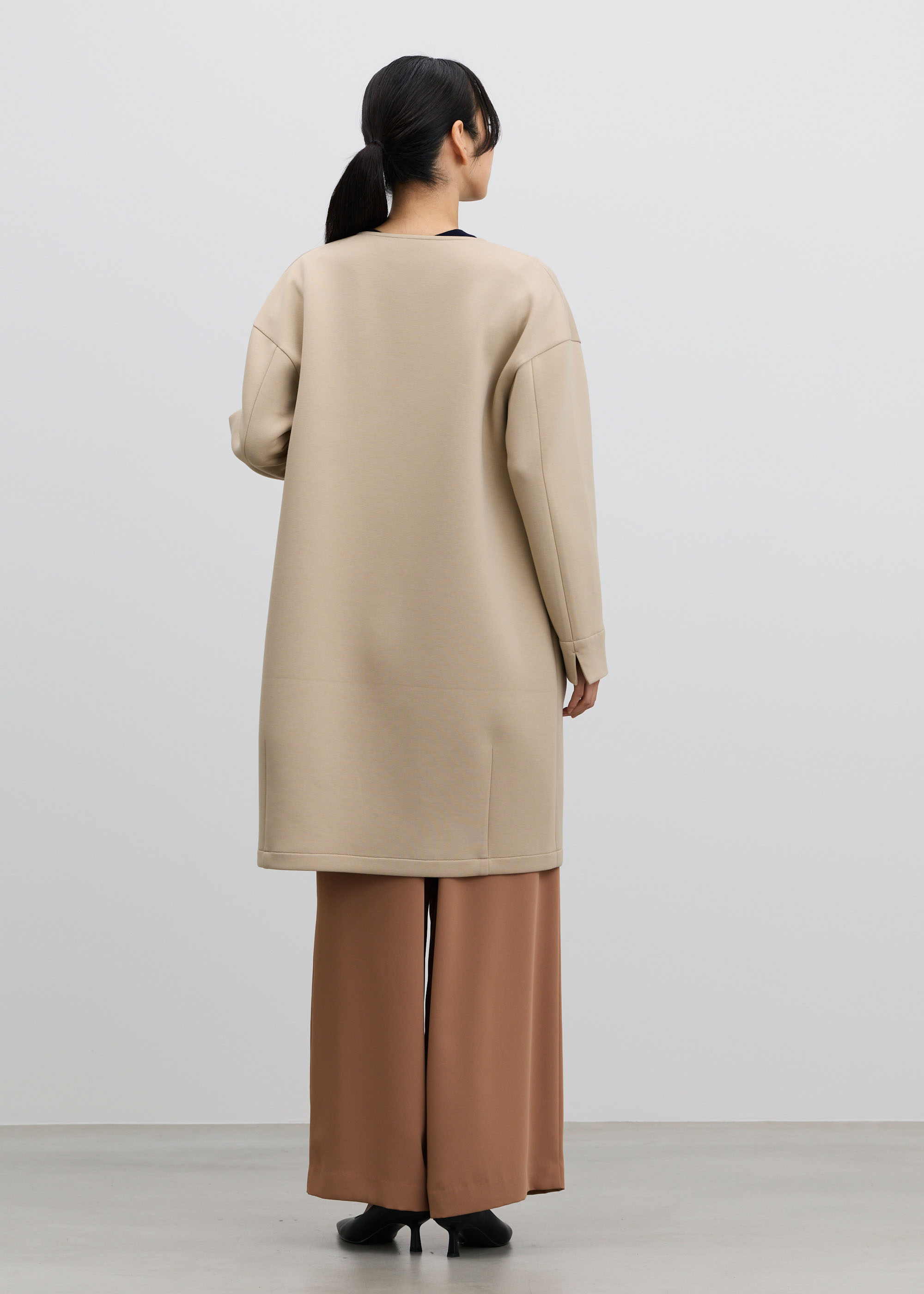 「ソフトダブルフェイスジップコート」は、以前ご好評いただいた2WAYコクーンジップワンピースをベースにしたもの。オンオフ対応する、きれいめなアウターとして、フォルムやディテールに改良を加え、より快適な着心地になるようブラッシュアップしました。
