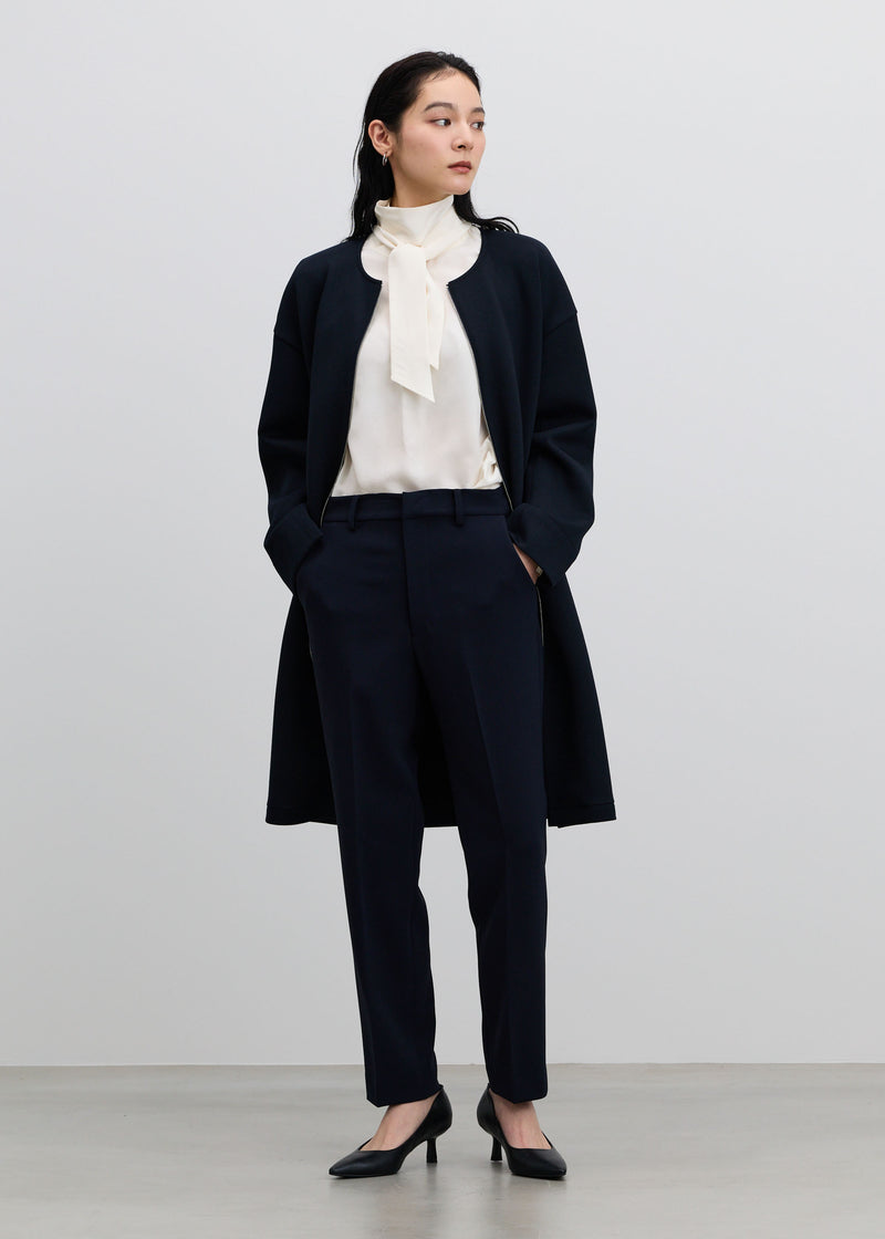 ジップアップとクルーネックからなるフロントは、余計な装飾はなくシックな雰囲気。ボウタイブラウスやタートルネックなど首元に高さのあるインナーとバランスよく着こなしていただけます。また、後ろの裾に布をつまんで縫い込むダーツを2本入れることで、立体感あるコクーンシルエットに。裾は適度にゆとりをもたせ、足さばきよく仕上げました。