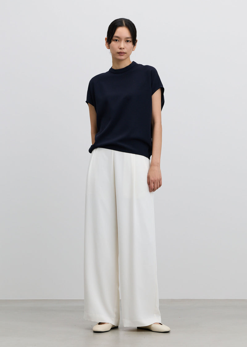 サラッとした肌触りが心地よく、ご自宅で洗濯できるイージーケアな点も嬉しいポイント。同生地のエスダブルクロスシリーズのアイテムとセットアップでの着用もおすすめです。