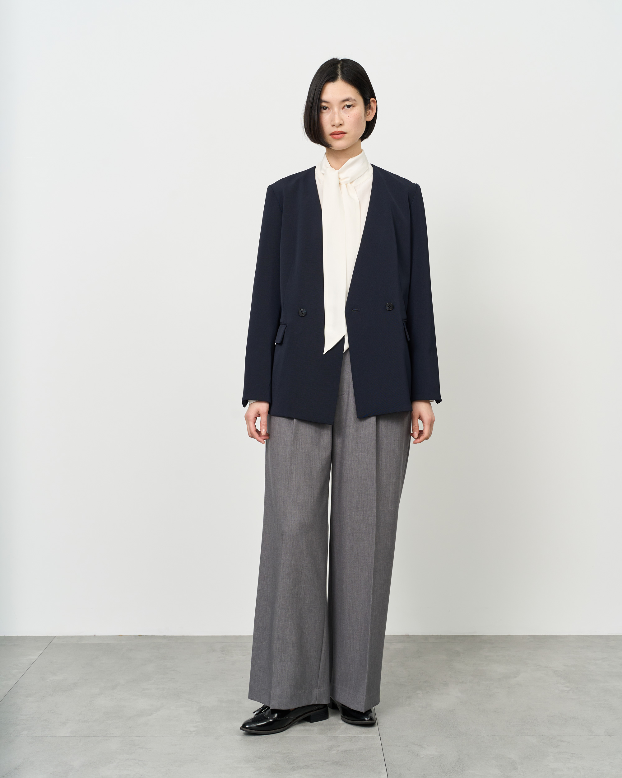 INNER:シルクボウタイブラウス(WHITE)PANTS:ウールライクワイドパンツ(GRAY)
