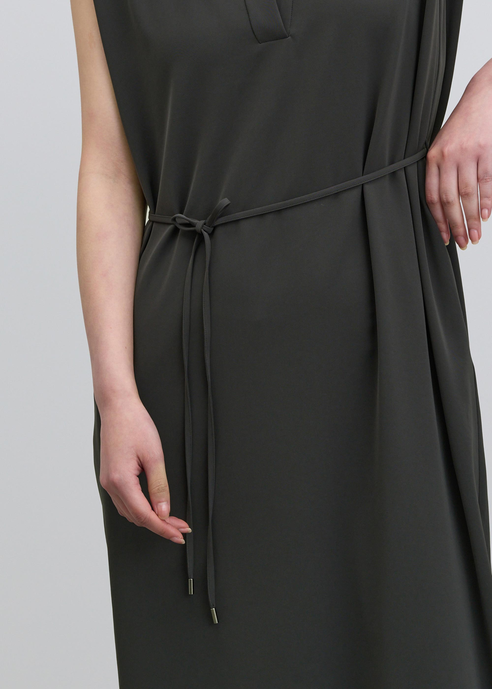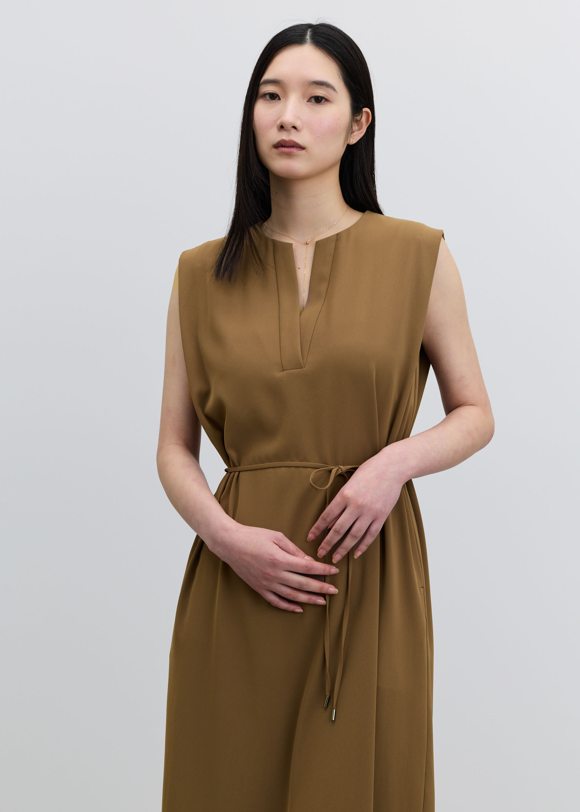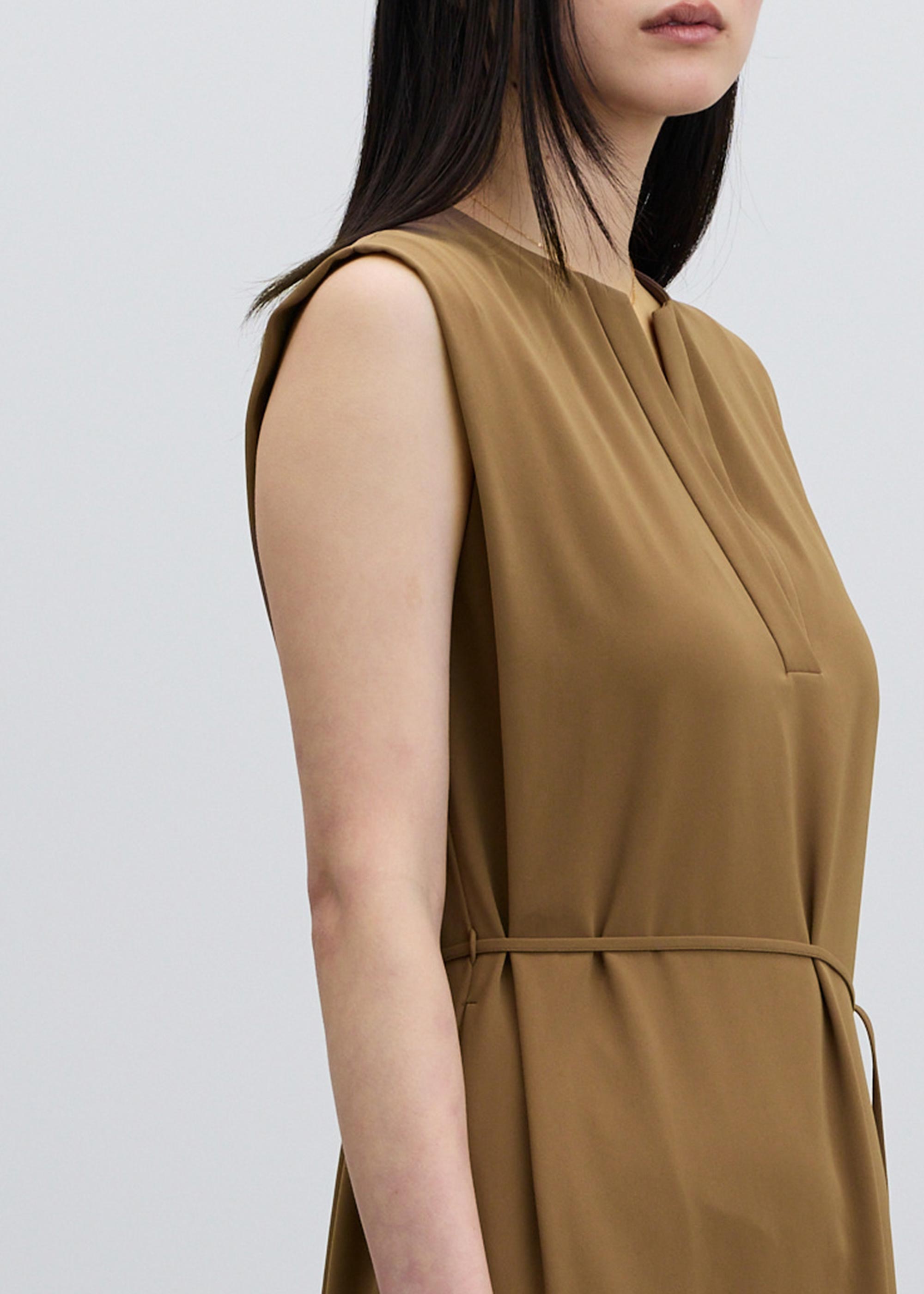 顔まわりをシャープに見せる深めのカッティングが、装いに知的さをプラス。肩に施したタックが、気になる二の腕をカバーします。取り外し可能なウエスト紐は、フロントで結んでエレガントに、バックで結んで凛とした佇まいにと、その日の気分に合わせたアレンジが可能です。