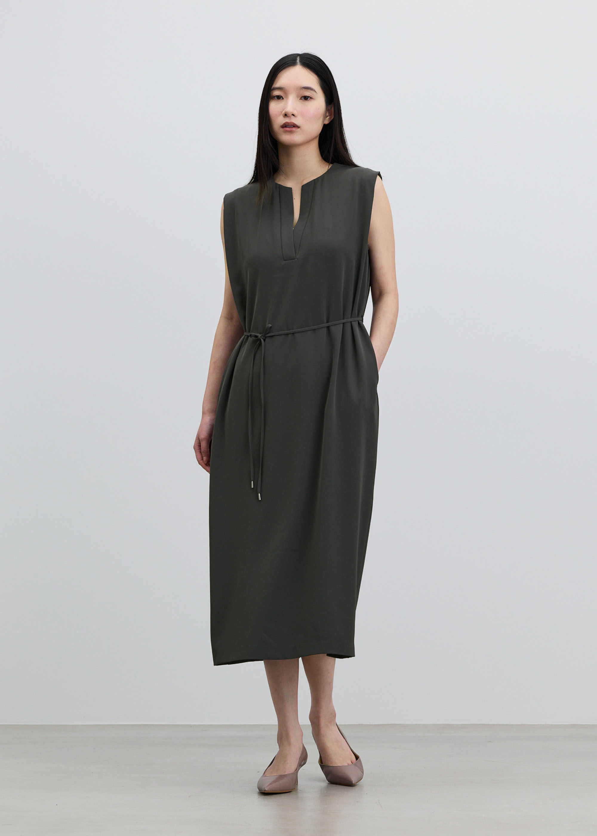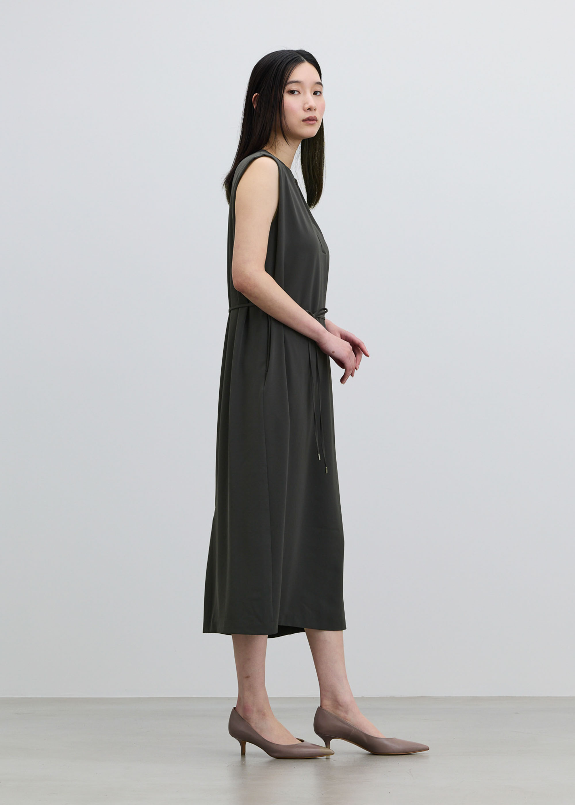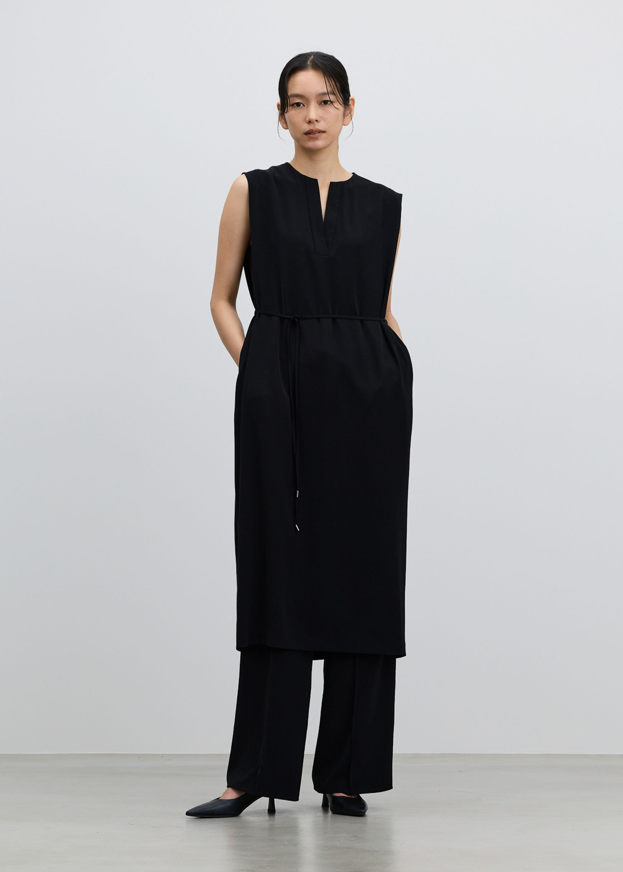 顔まわりをシャープに見せる深めのカッティングが、装いに知的さをプラス。肩に施したタックが、気になる二の腕をカバーします。取り外し可能なウエスト紐は、フロントで結んでエレガントに、バックで結んで凛とした佇まいにと、その日の気分に合わせたアレンジが可能です。