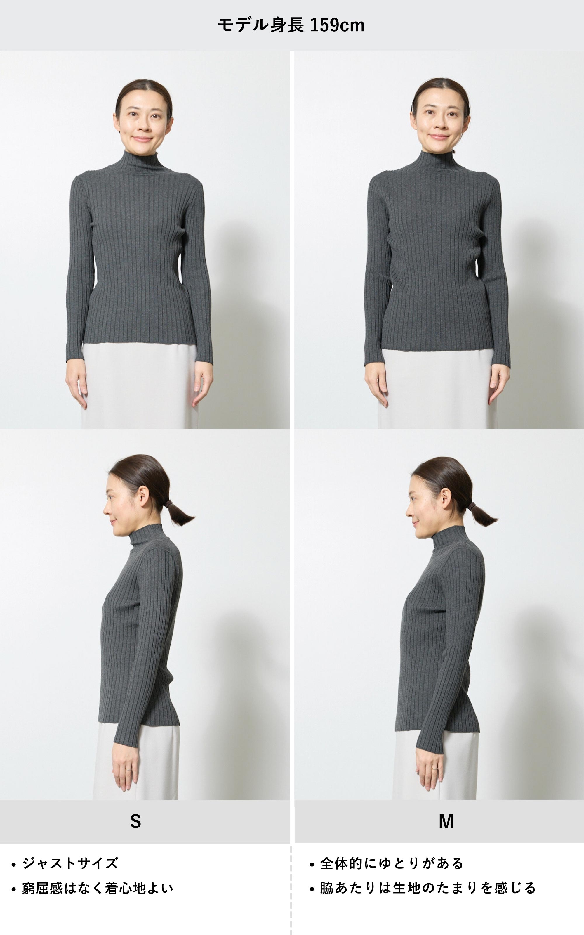 リブの特徴の伸縮性で着心地よく、合わせるボトムスを選ばないタートルネックニット。ネックラインに沿う折り返しのない軽やかなタートルネックで、シンプルに一枚でも、ワンピースやジャケットの中にもすっきりと着用いただけます。