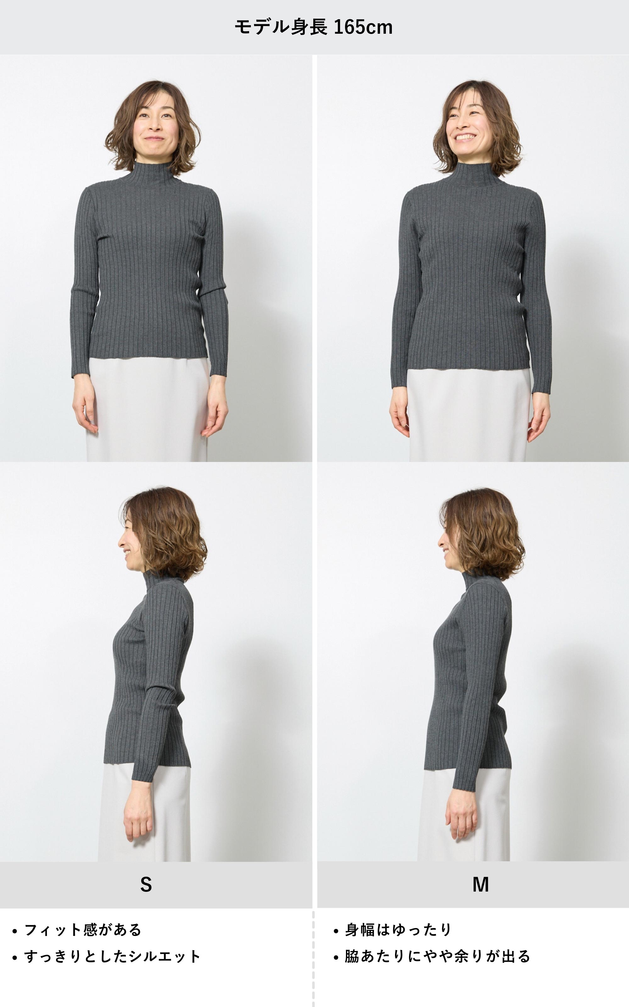 リブは「膨張して見えるのでは…」と不安を感じられる方もいらっしゃるかもしれませんが、なるべく体型を選ばず着ていただけるように試作段階で何度も身幅を調整しました。Sサイズはフィットしてスッキリと、Mサイズはタイト過ぎず程よいフィット感になるサイズ感に仕上げています。