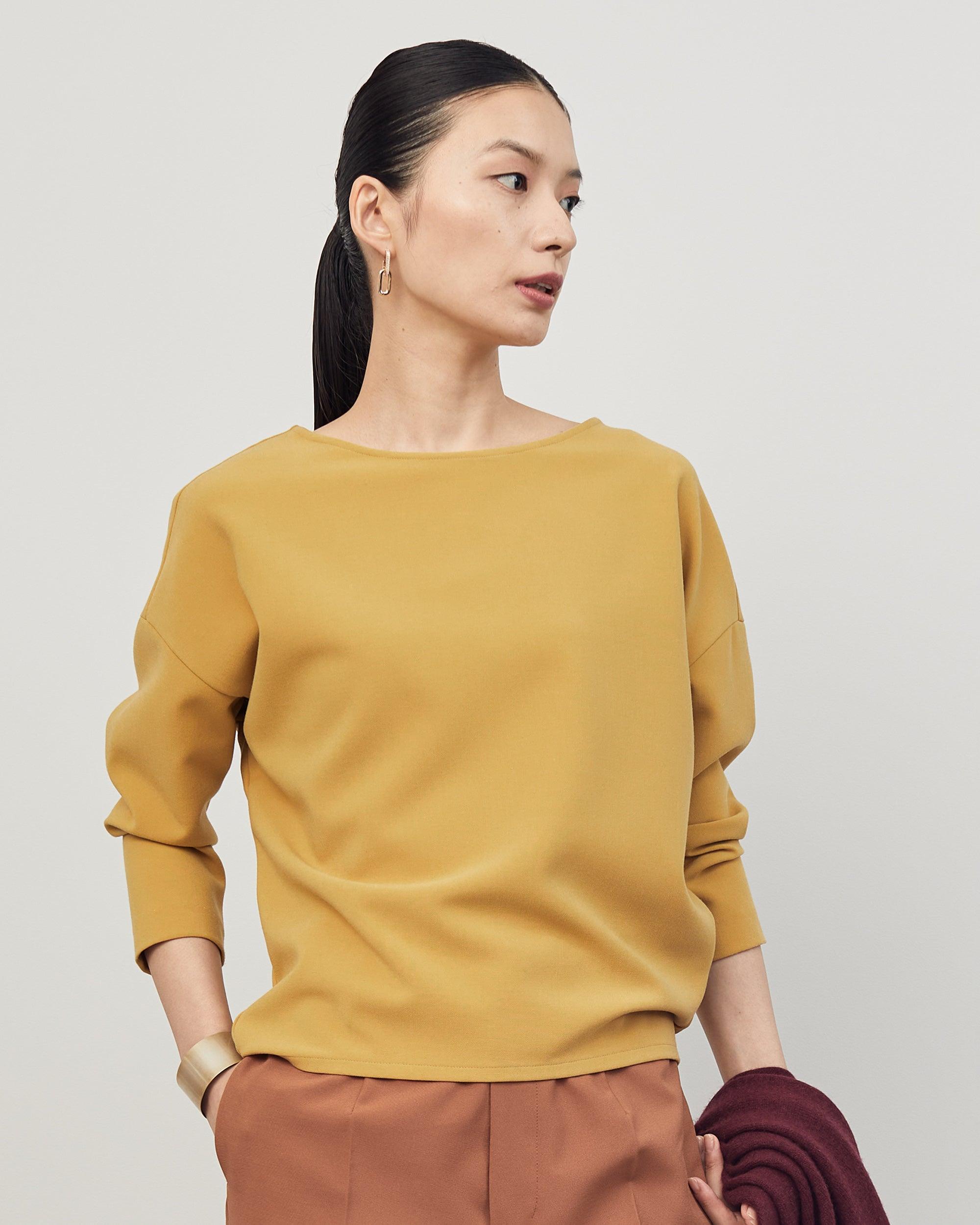 「ウールライクコクーンブラウス8分袖」は、美しいシルエットでコーデを一段格上げしてくれる、襟なしのきれいめブラウスです。