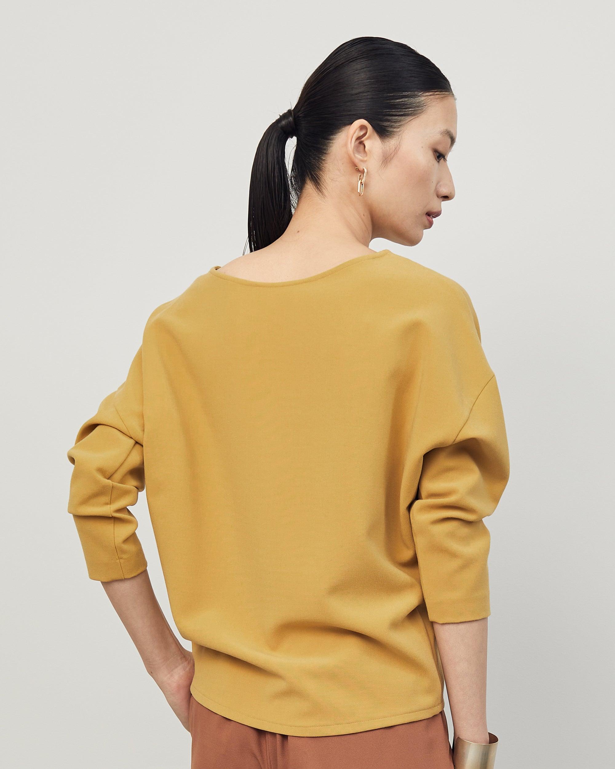 ¥ウールライクコクーンブラウス8分袖は、ウエストに向かってゆるやかに細くなるコクーン(繭)型のシルエットで、手首が見える8分袖のデザイン。視覚効果でウエストと手首を細く見せてくれます。ぴったりとしないからこそすっきり見えるマジックを、きっと感じていただけるシルエットです。