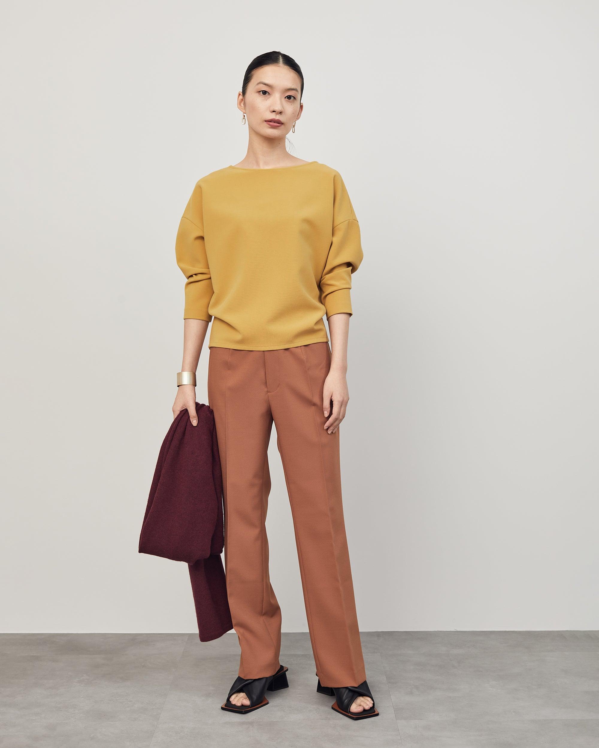 柔らかな感触と程よい張り感、そしてスーツ地のような表情を持つウールライク生地を使用。テロテロではなく程よく肉厚な生地なので、3Dニットと同じような立体的なシルエットを実現し、ゆとりがある部分も程よくボディに馴染みます。