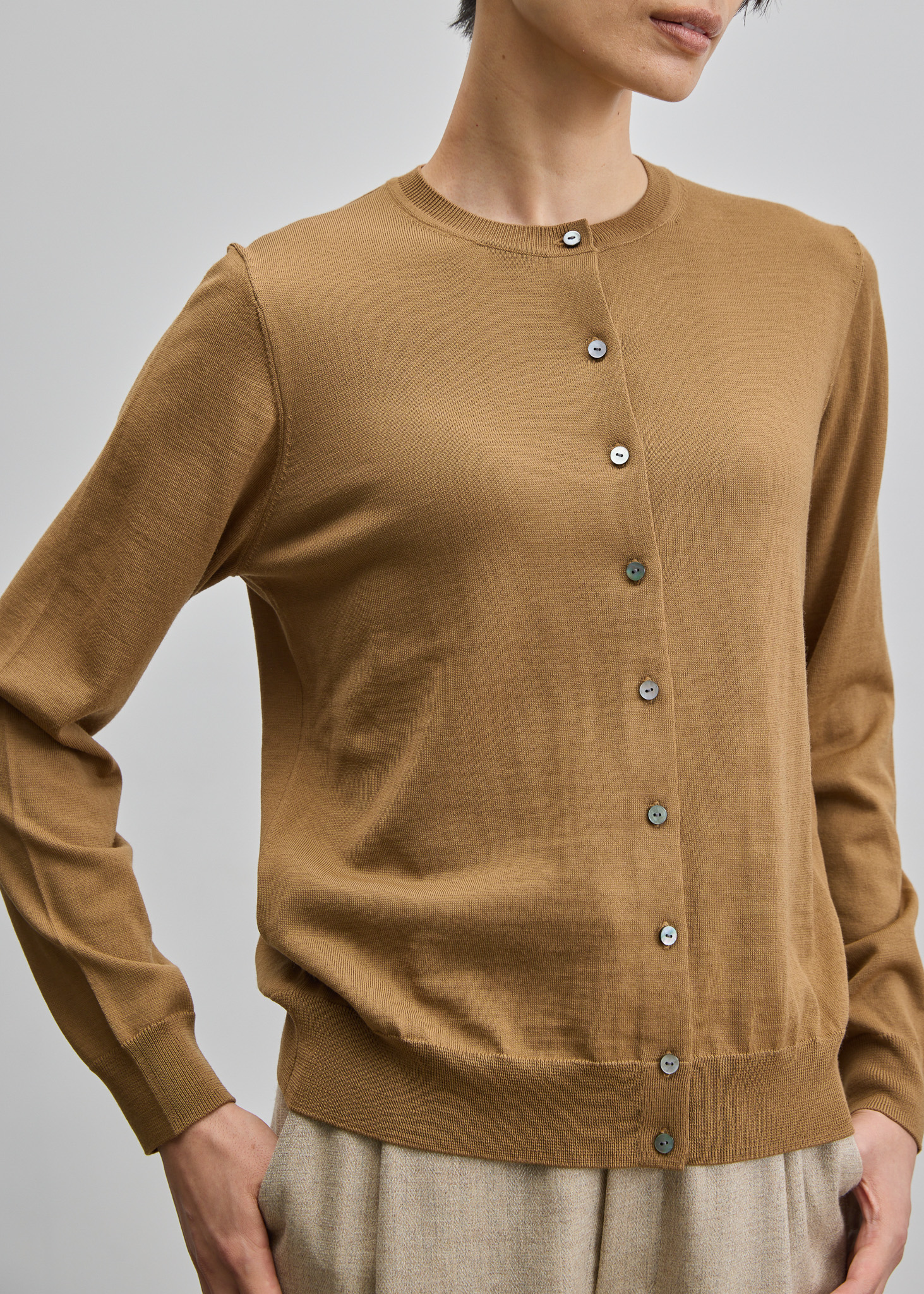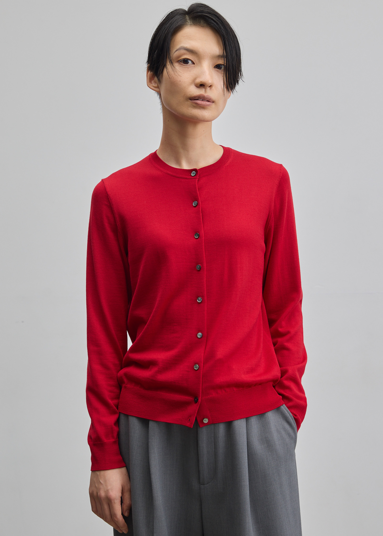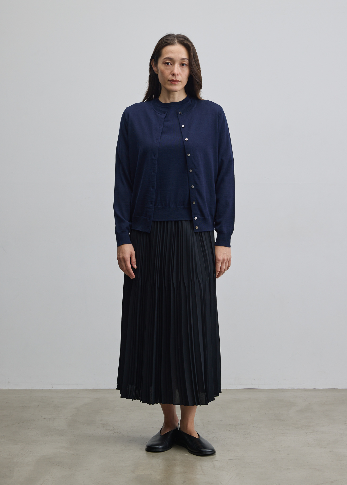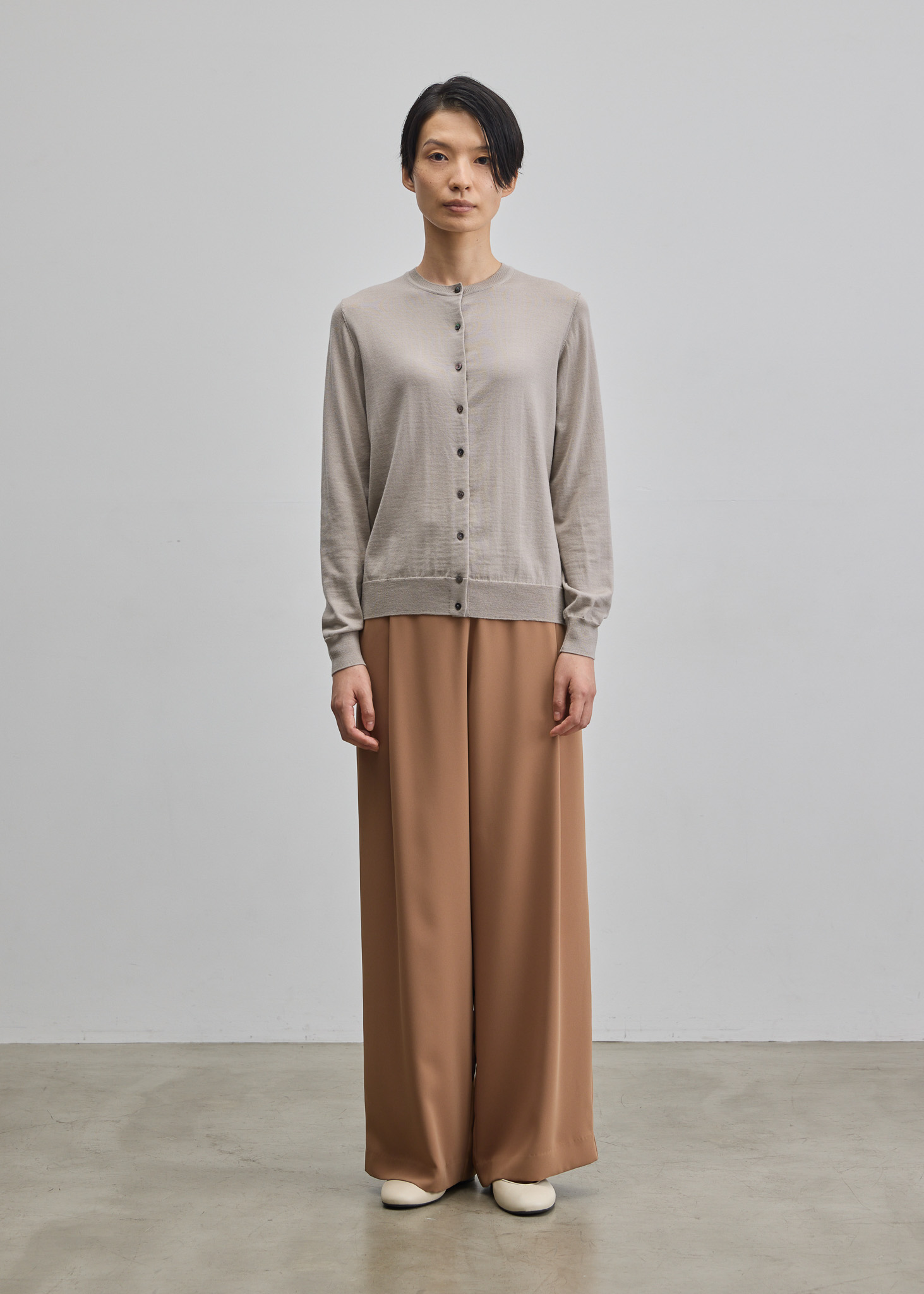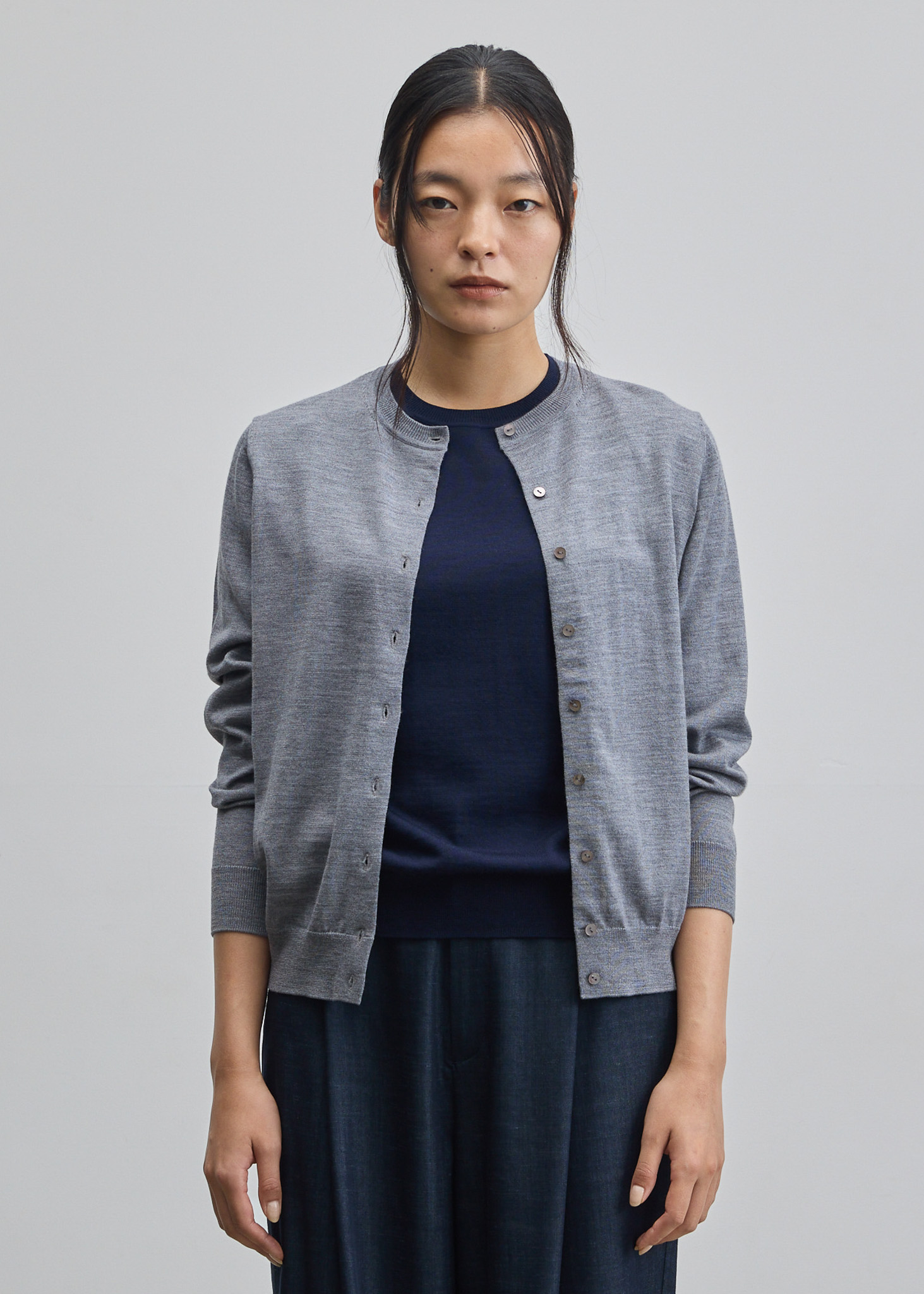 洗練されたデザインの上質素材のウールカーディガン。ボディラインを拾わずスタイルアップを実現する一枚です。