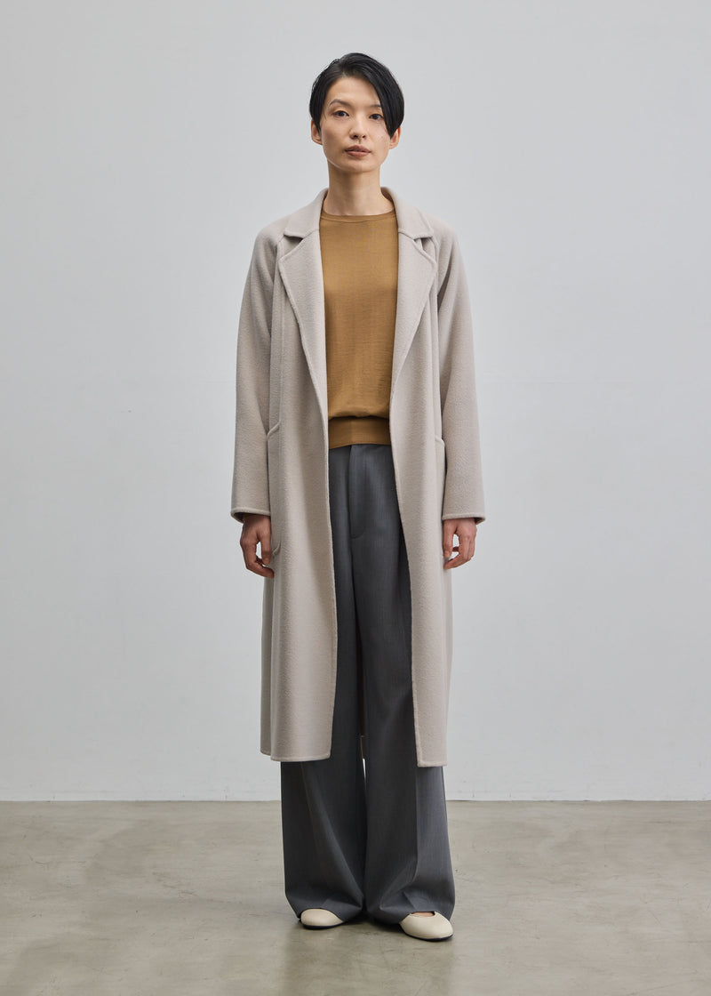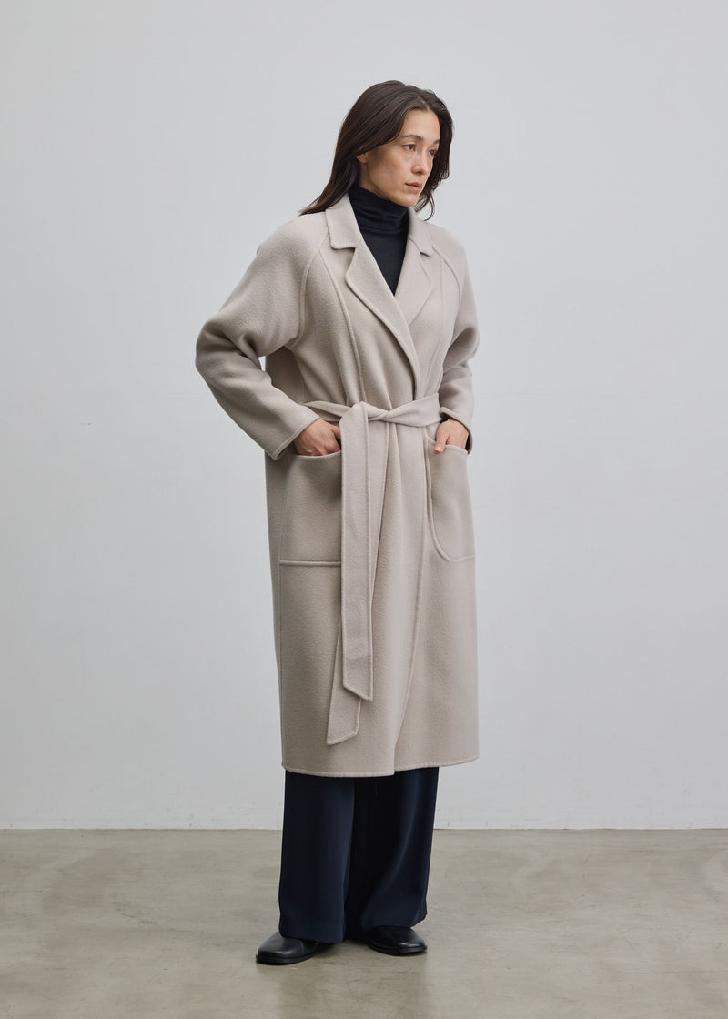 ゆったりと幸福感に包み込まれるウールリバーローブコート。中に着用するものを選ばず、さっとまとうだけで洗練された印象に仕上がります。