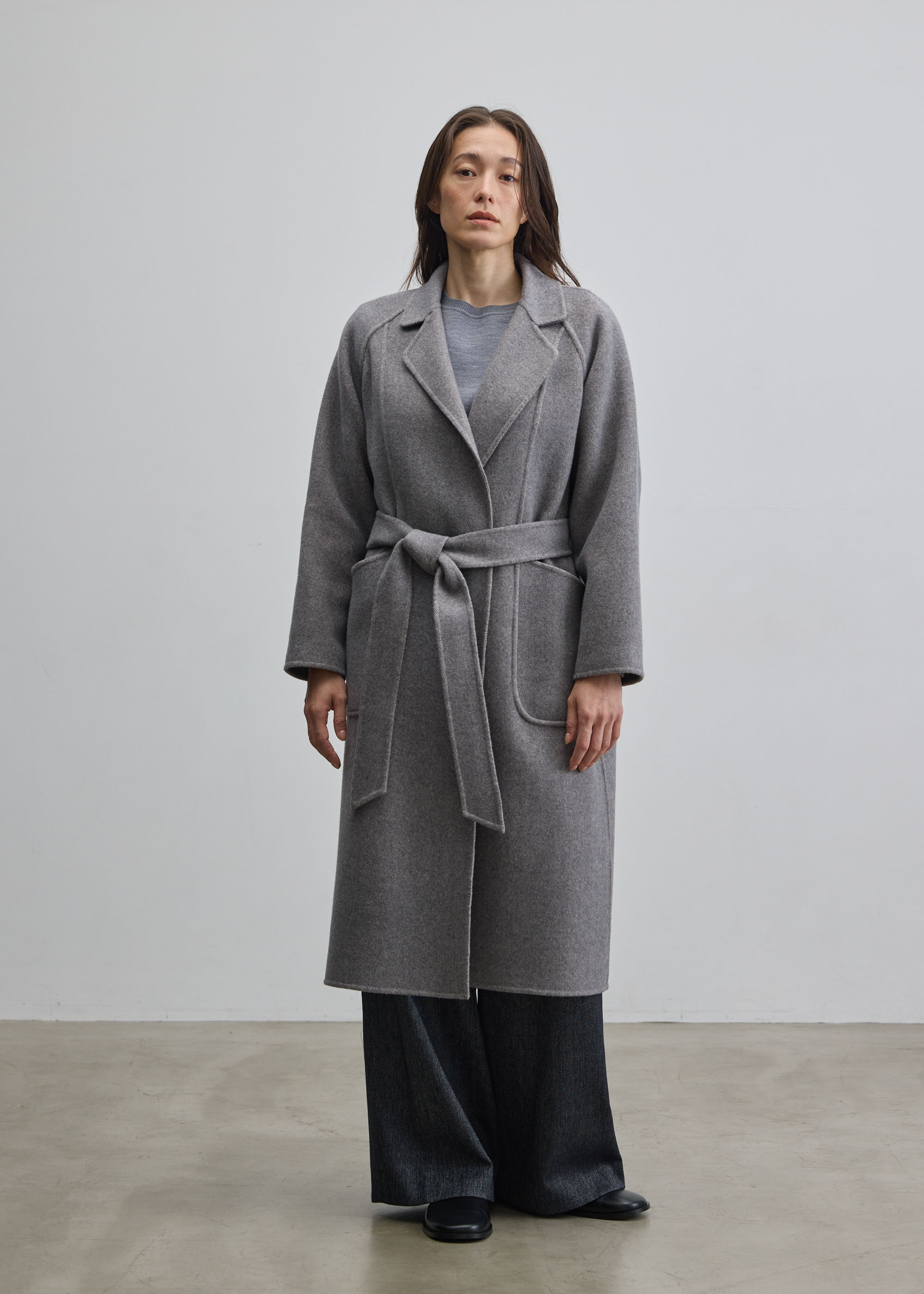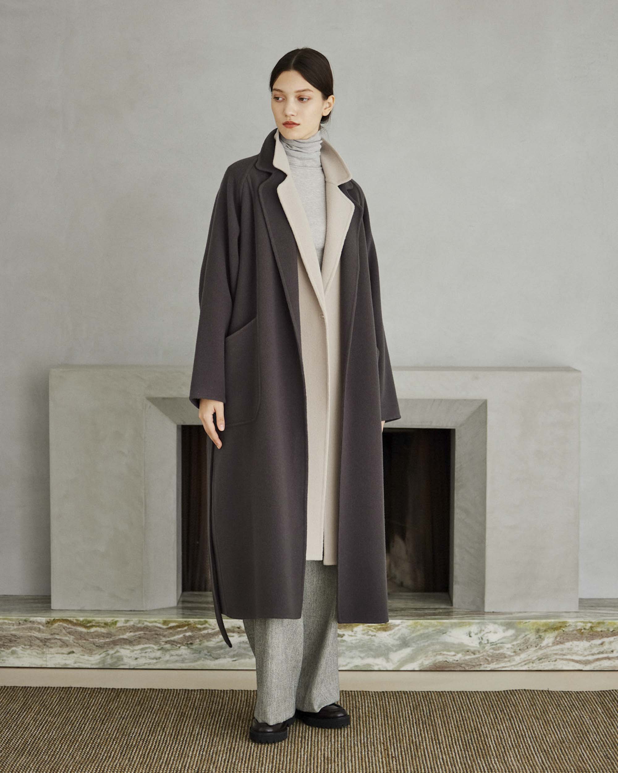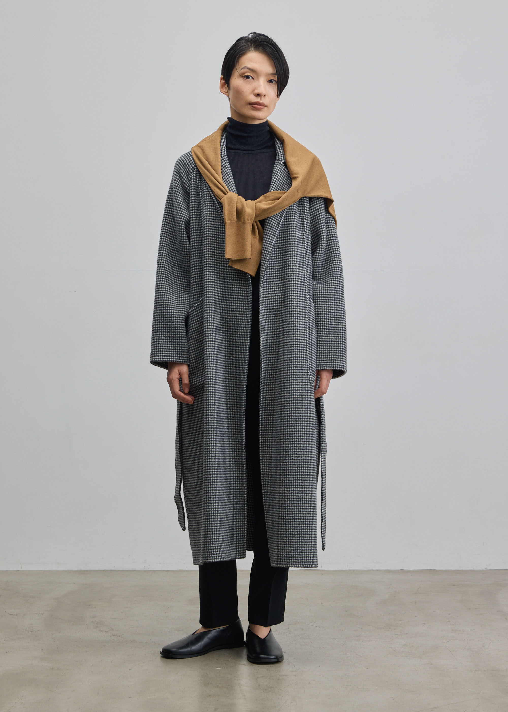 ゆったりと幸福感に包み込まれるウールリバーローブコート。中に着用するものを選ばず、さっとまとうだけで洗練された印象に仕上がります。